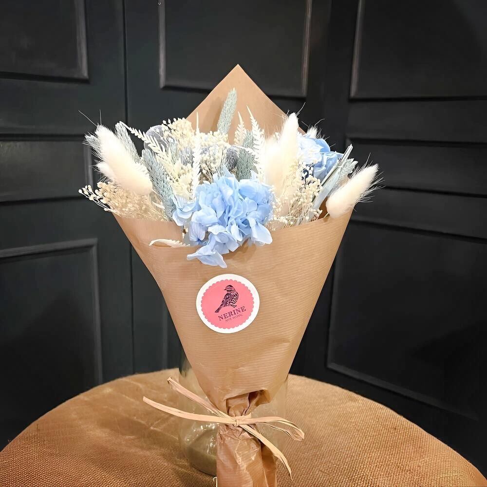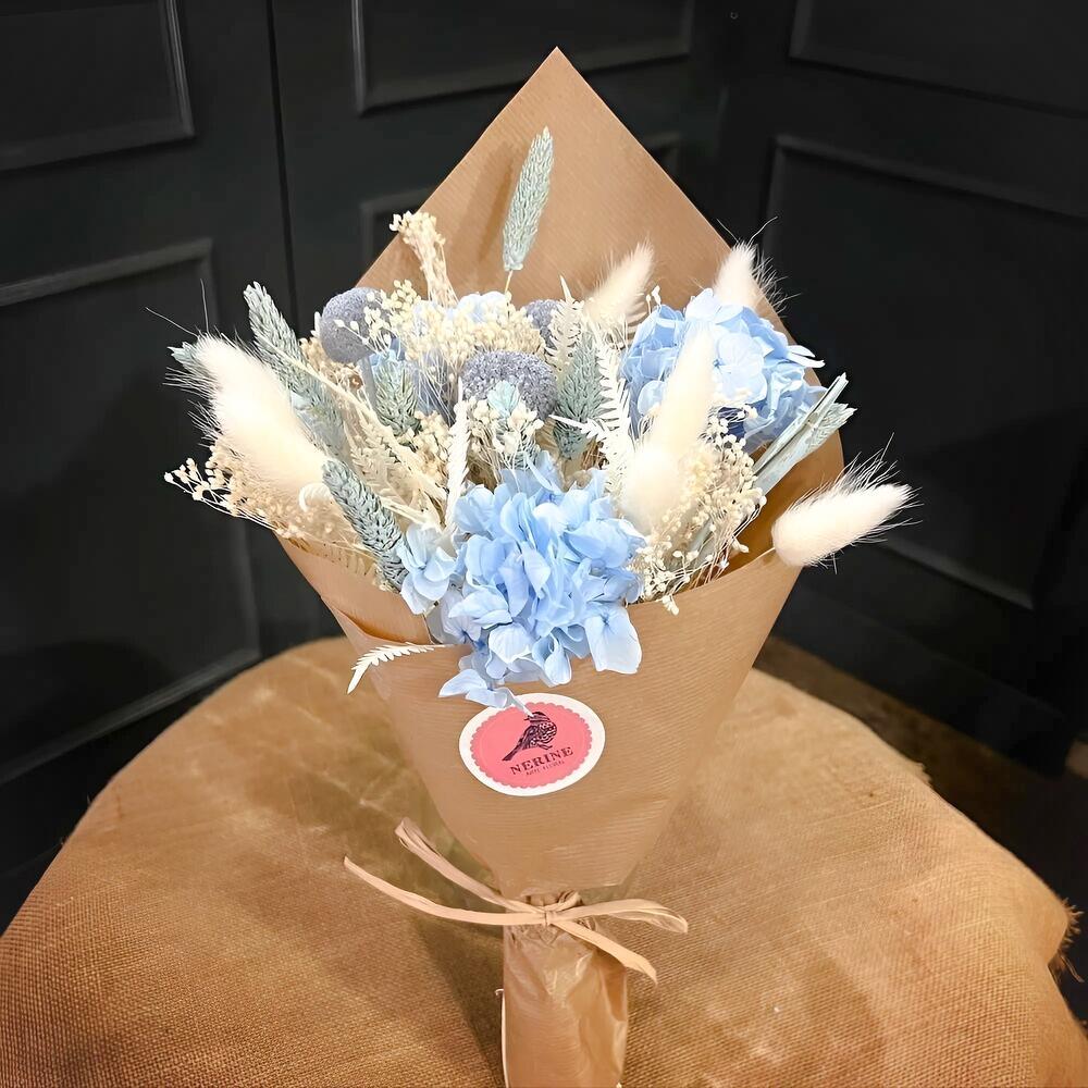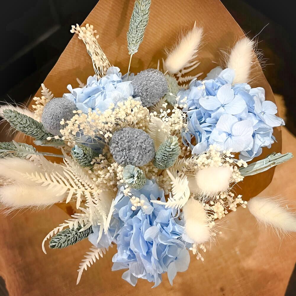 lagurus blanco - 6 ud. brum blanco - 3 ud. hortensia celeste - 2 ud. craspedia gris - 3 ud. trigo celeste - 6 ud.