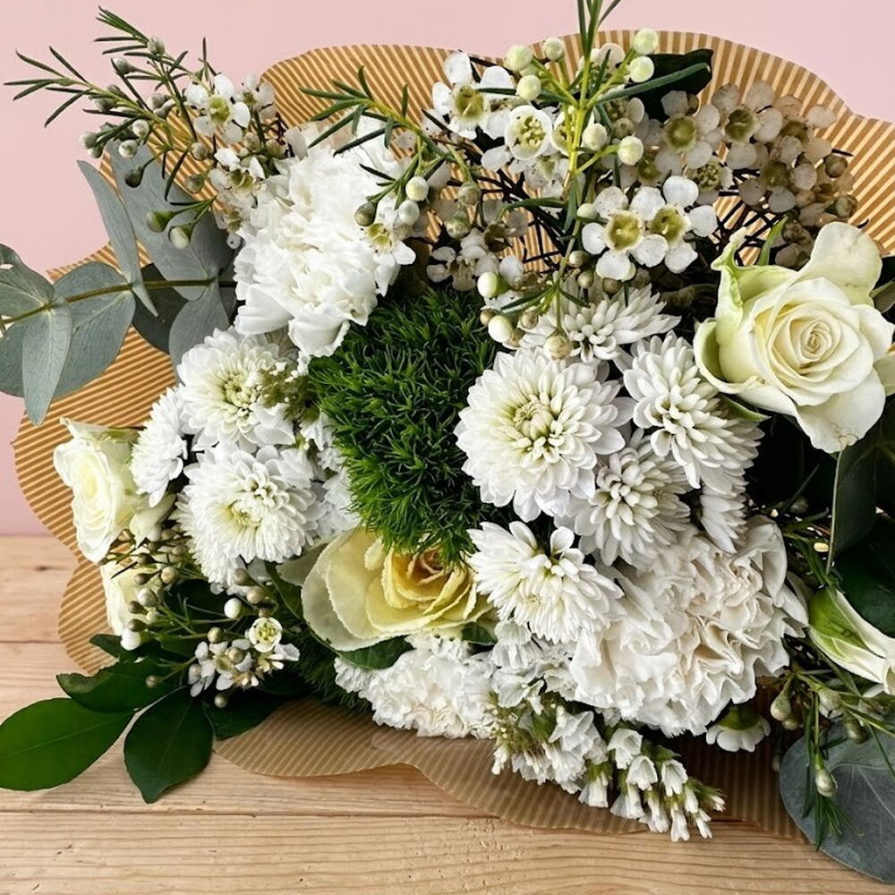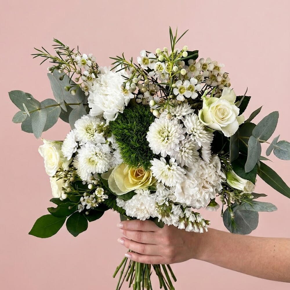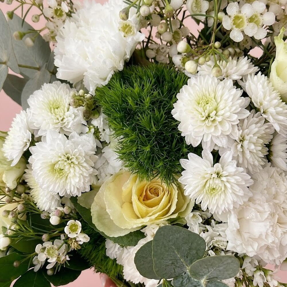 El ramo Clara es perfecto para regalar o decorar la casa. Es elegante y luminoso. Está hecho con flores variadas en tonos blancos y beige y verdes de temporada. (Las flores pueden presentar variaciones en color, tamaño y forma debido a factores naturales y de temporada. La imagen mostrada es ilustrativa; el arreglo final será muy similar pero está sujeto a las flores de cada estación )