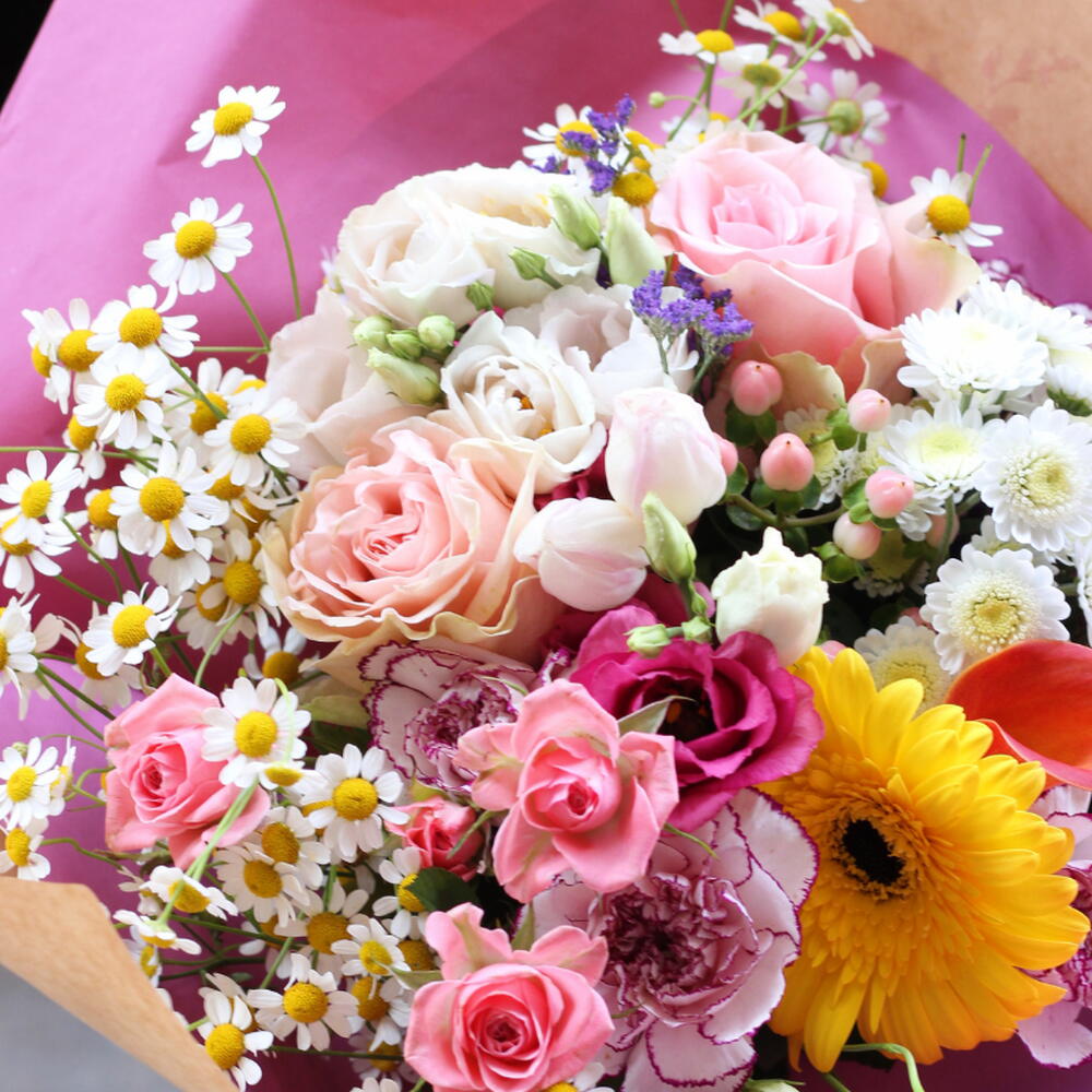 Gerbera - 1 ud. tulipanes - 2 ud. lysianthus - 2 ud. clavel - 2 ud. hypercum - 1 ud. camomila - 2 ud. rosa color rosa 60cm - 2 ud. vara rosa spray - 1 ud. papel decorativo deluxe - 1 ud.