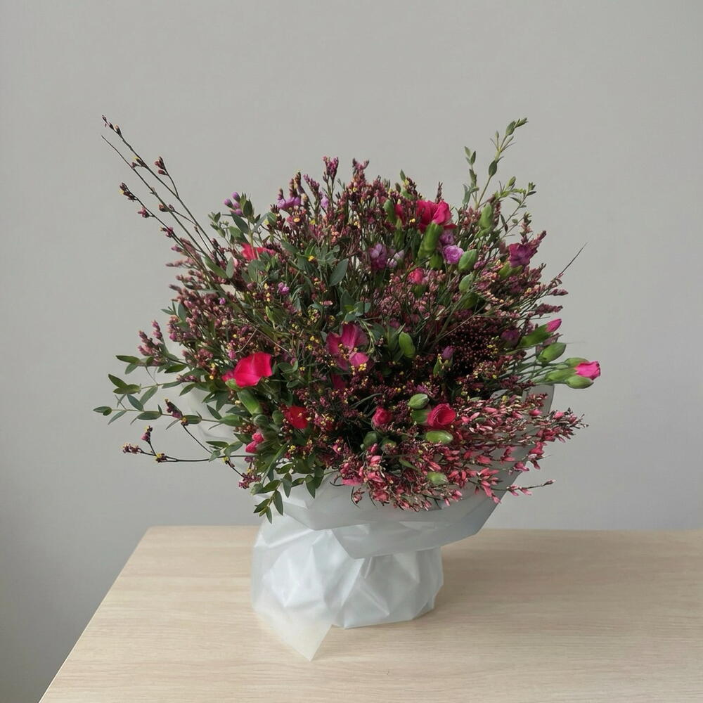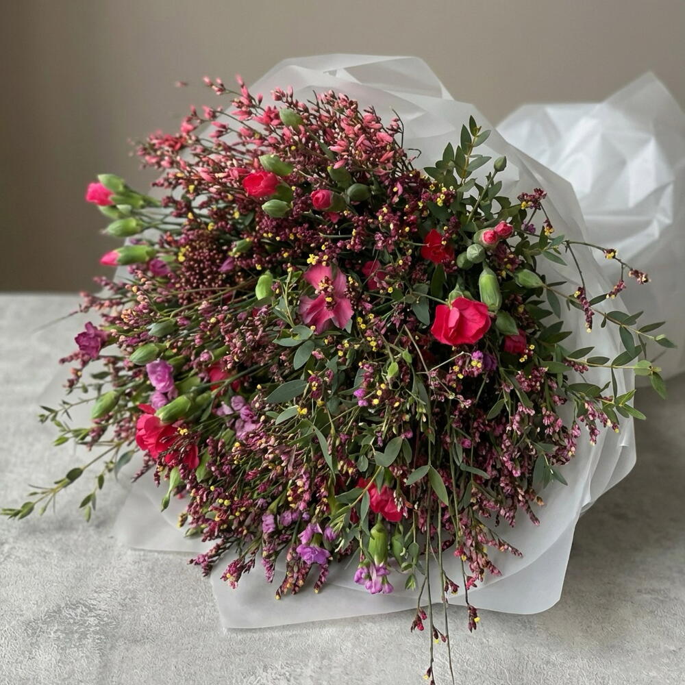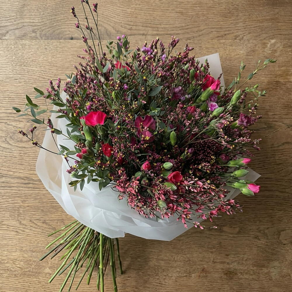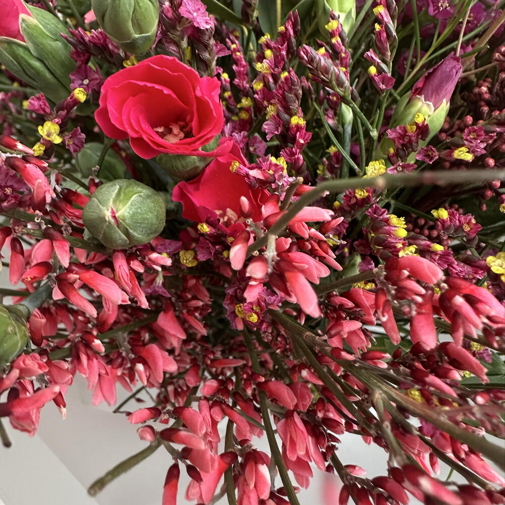 Statice - 3 ud. skimmia - 3 ud. eucalipto - 2 ud. genista - 1 ud. clavel - 6 ud. chamelacium - 1 ud.