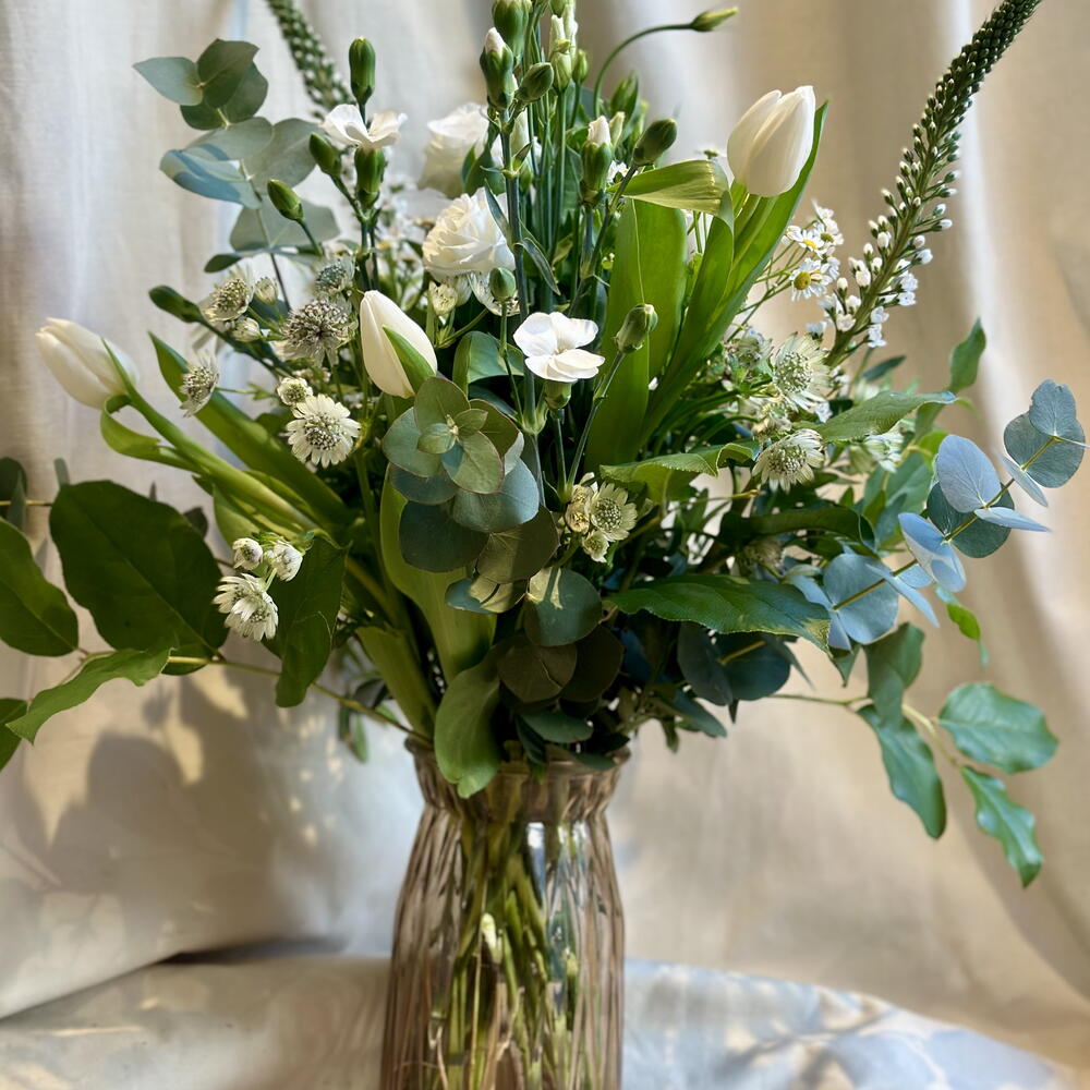eucalipto - 8 ud. verdes variados - 5 ud. claveles blancos - 6 ud. tulipanes blancos - 5 ud. verónica blanca - 3 ud. astrantia blanca - 7 ud.