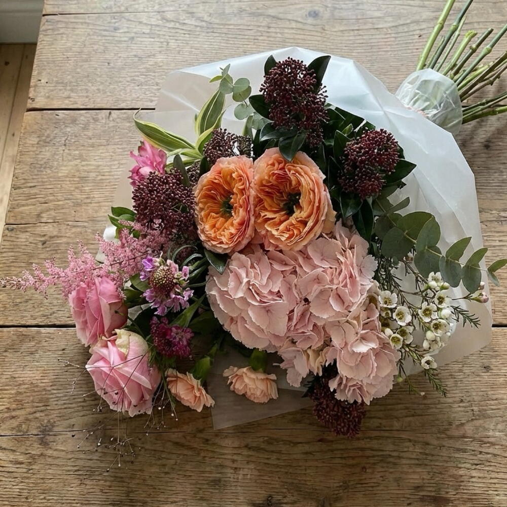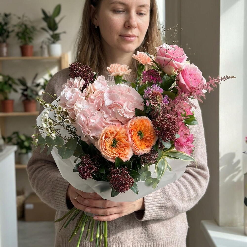 Alstroemeria - 2 ud. hortensia - 1 ud. skimmia - 1 ud. astilbe - 2 ud. eucalipto - 1 ud. rosa - 5 ud. clavel - 3 ud.