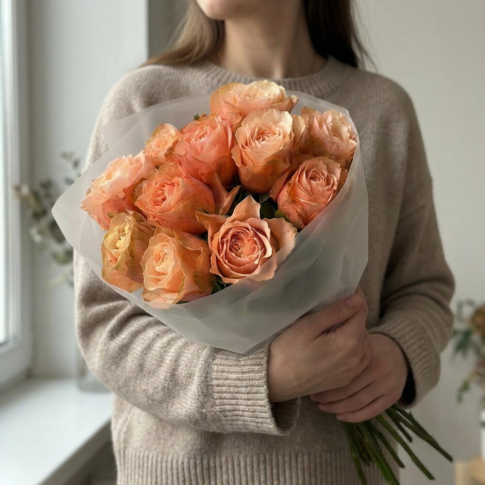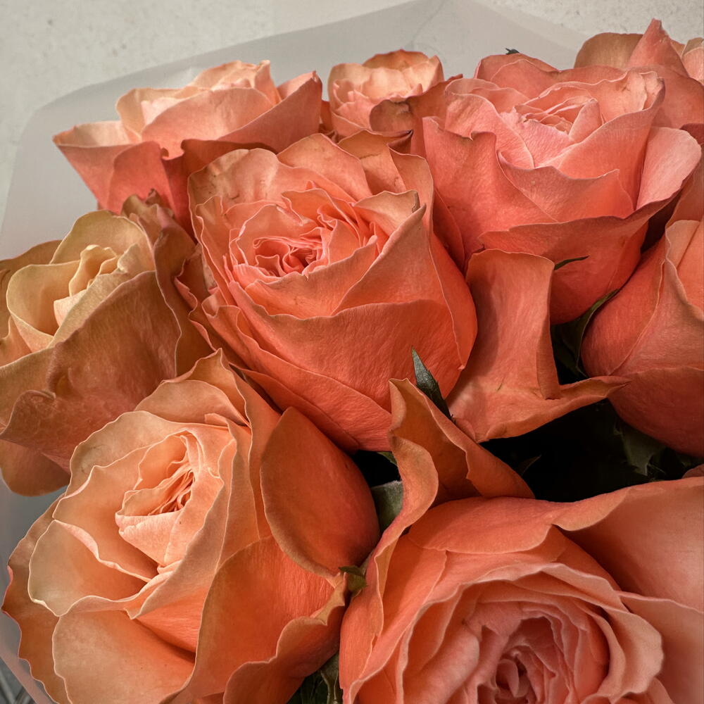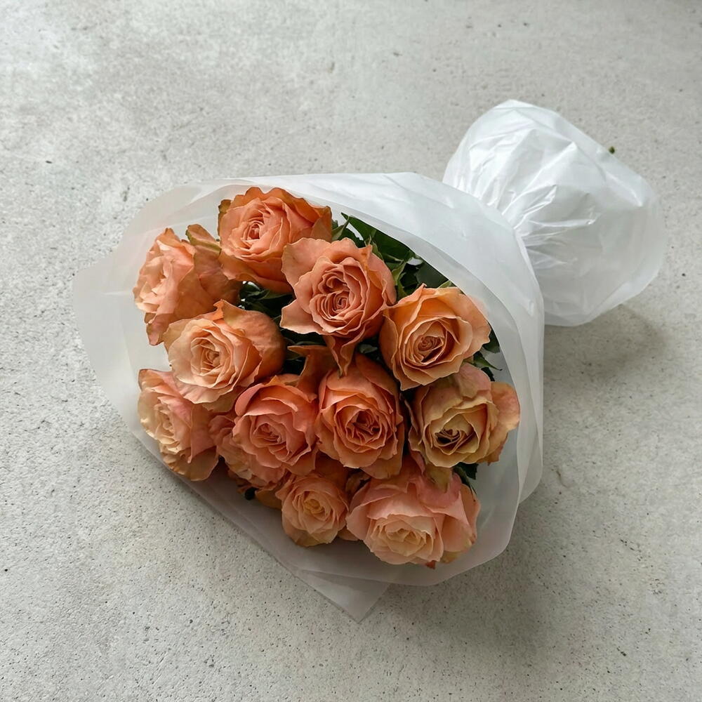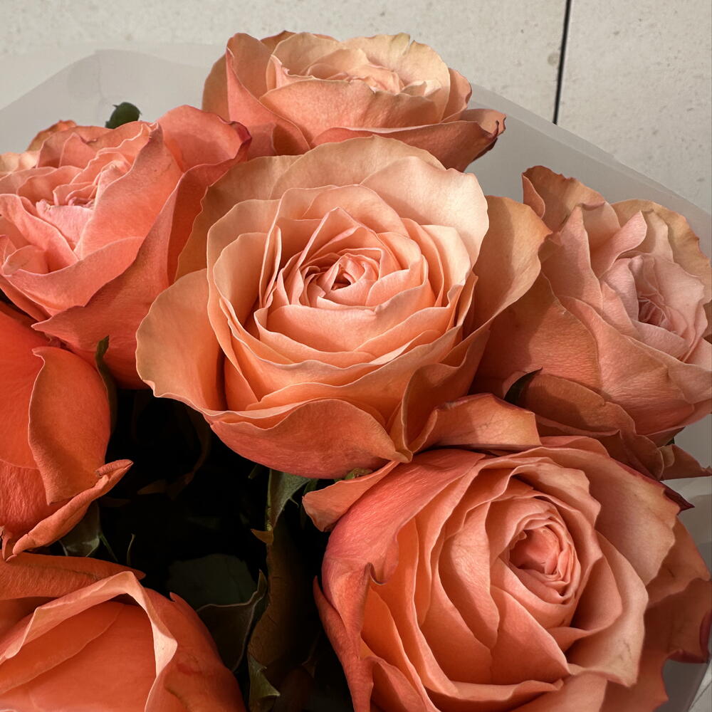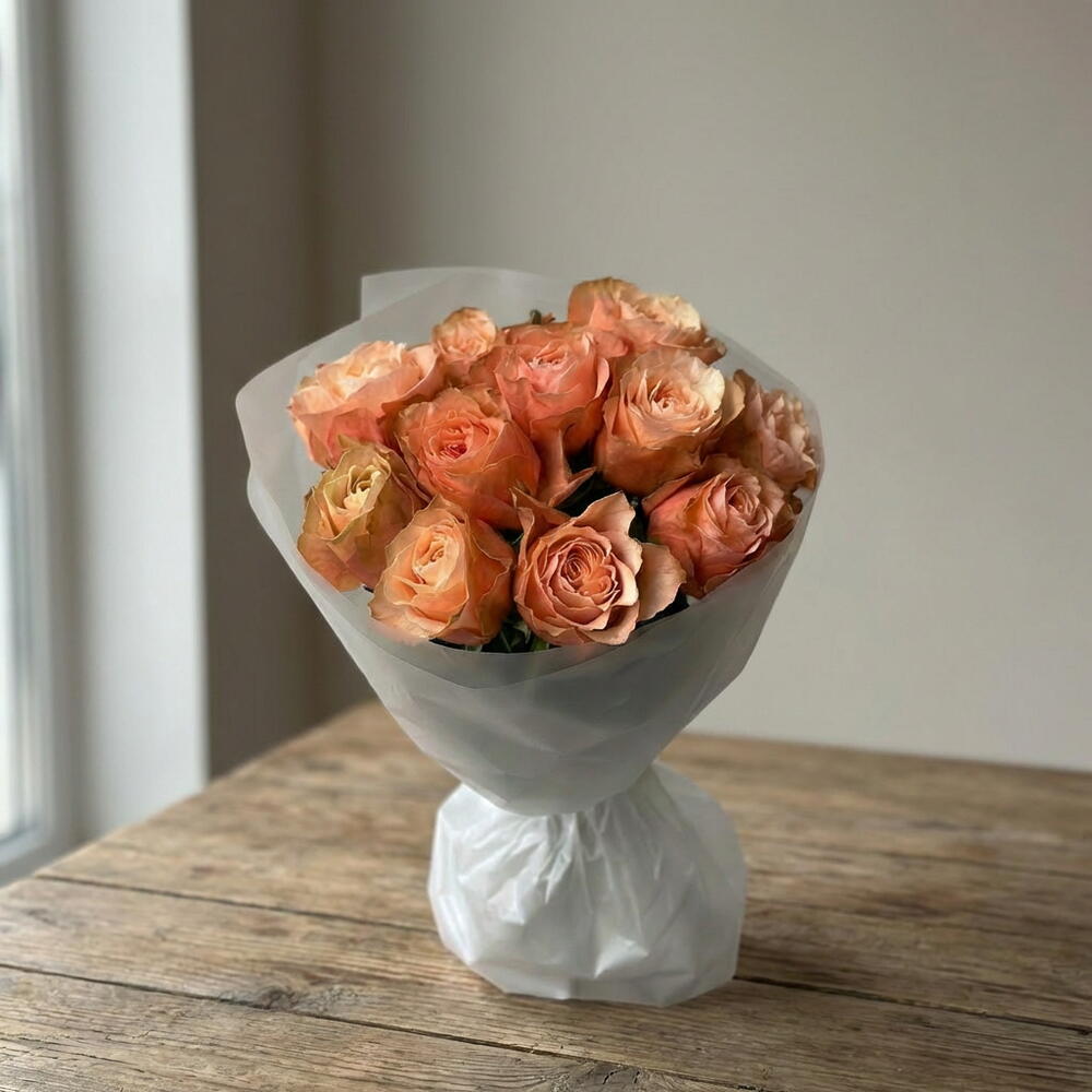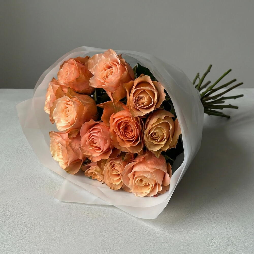 Un ramo sofisticado compuesto por 11 rosas Kahala, una variedad exclusiva reconocida por sus tonos únicos que combinan matices durazno, arena y suaves toques rosados.