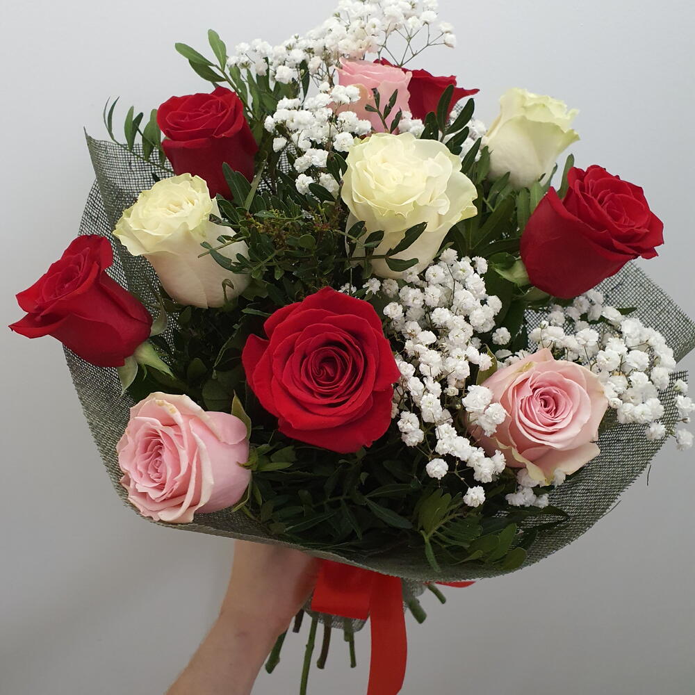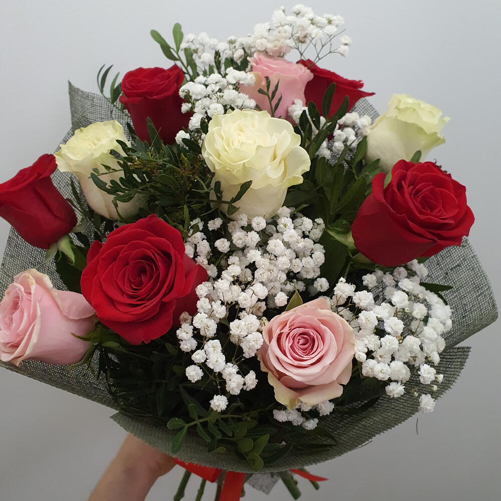Este elegante ramo combina rosas rojas, blancas y rosadas en una composición llena de contraste y armonía. Las flores simbolizan amor, pureza y ternura, creando un mensaje profundo y especial. Los delicados toques de paniculata aportan ligereza y un aire romántico al conjunto. El follaje verde enmarca perfectamente cada flor, realzando su color y frescura. Su envoltorio discreto y sofisticado completa el diseño con un toque moderno. Es ideal para expresar sentimientos sinceros en cualquier ocasión importante. Un bouquet que transmite emoción y belleza en cada detalle.