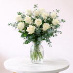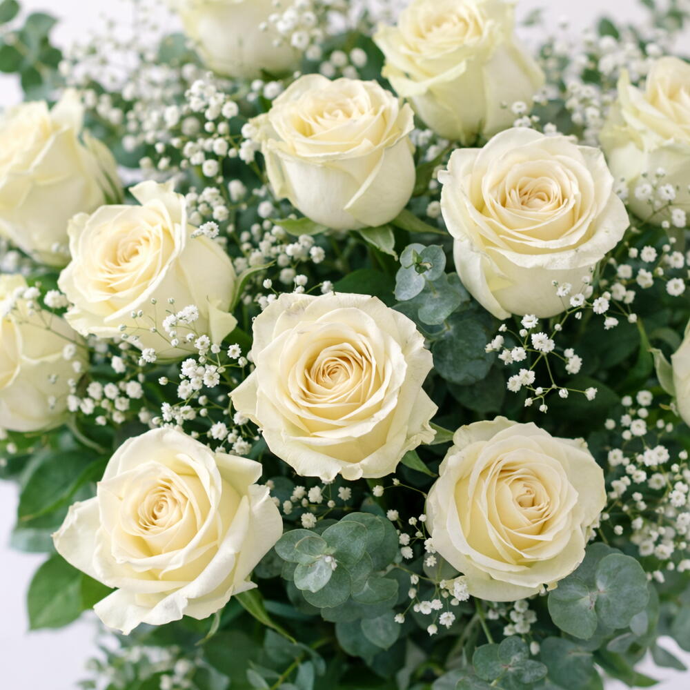 Ramo de rosas blancas, compuesto por rosas frescas de gran calidad, acompañadas de paniculata y eucalipto que aportan textura y un toque silvestre muy equilibrado. Es un diseño limpio, luminoso y versátil, perfecto para regalar en cualquier ocasión: desde un detalle especial hasta momentos más emotivos. La combinación de tonos suaves y verdes hace que encaje en cualquier estilo, sin resultar recargado. Un ramo que transmite calma, delicadeza y buen gusto. De los que nunca fallan.