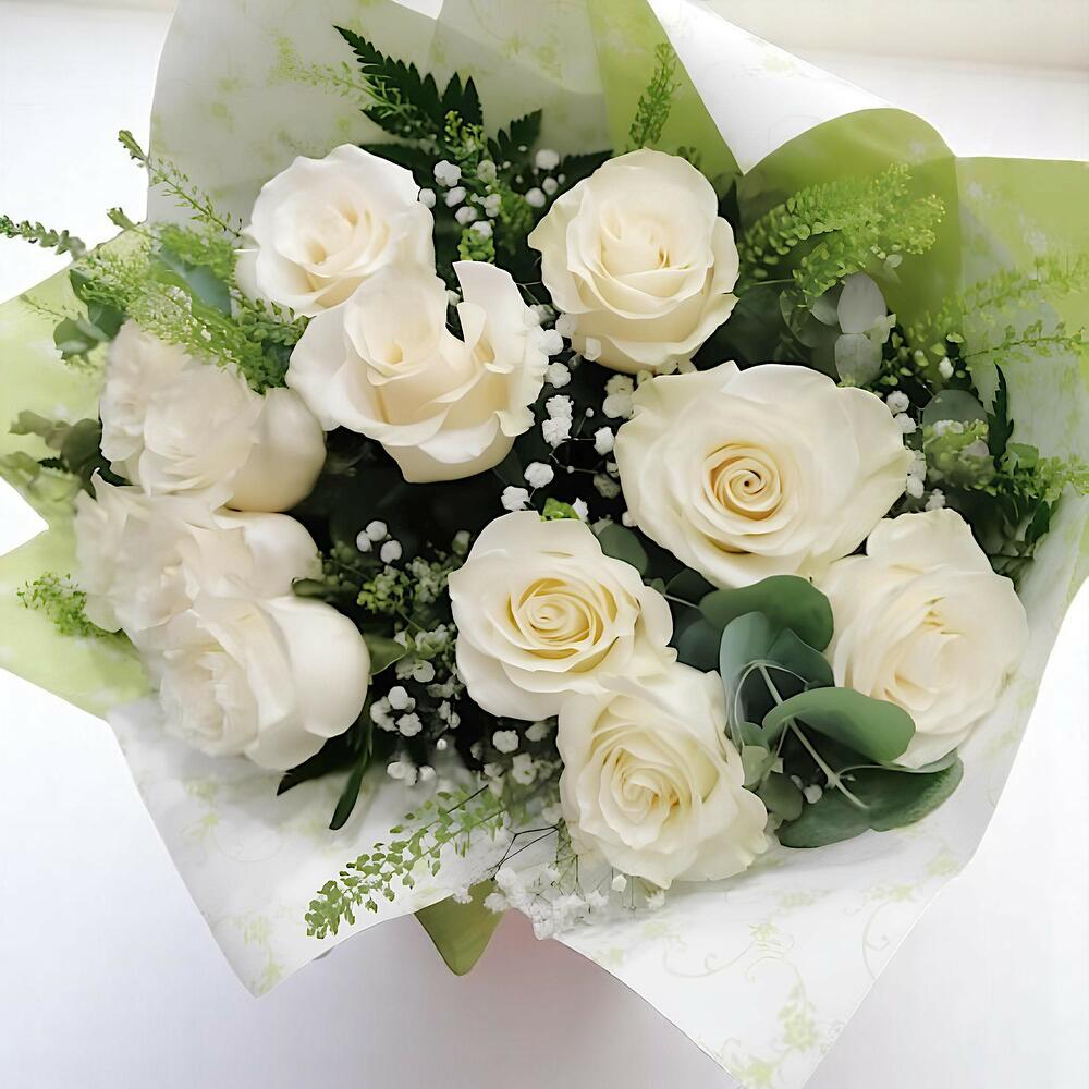 verdes variados de temporada - 8 ud. helecho de cuero - 6 ud. rosas blancas tallo largo - 12 ud. paniculata o limoniun blanco - 2 ud.