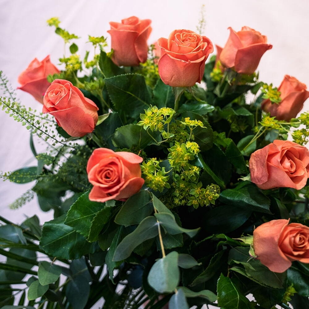 Ramo de 12 Rosas naranjas acompañado de diferentes variedades de verdes y envuelto para regalo.