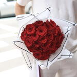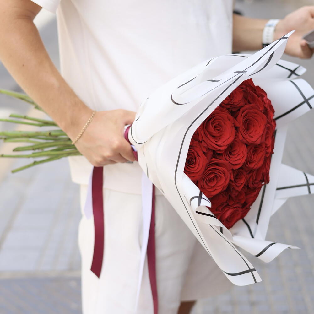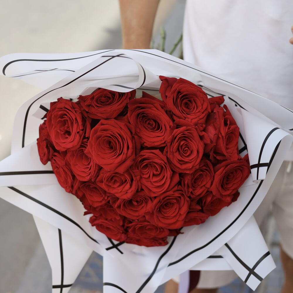 Haz que ese momento especial sea eterno con este impresionante ramo de 25 rosas rojas, símbolo clásico del amor y la pasión. Cada rosa ha sido seleccionada a mano para ofrecerte una presentación perfecta, acompañada de una envoltura moderna y sofisticada que realza su belleza. ✨ Características: • 25 rosas rojas naturales de tallo largo y frescura garantizada • Envoltorio elegante con diseño artístico en blanco y negro • Tarjeta con mensaje personalizado (opcional) • Listo para entregar en mano o a domicilio