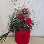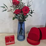 rosas rojas - 3 ud. bombones - 1 ud. verdes decorativos - 3 ud. ramas decorativas naturales - 2 ud. limonium flor de relleno - 1 ud.