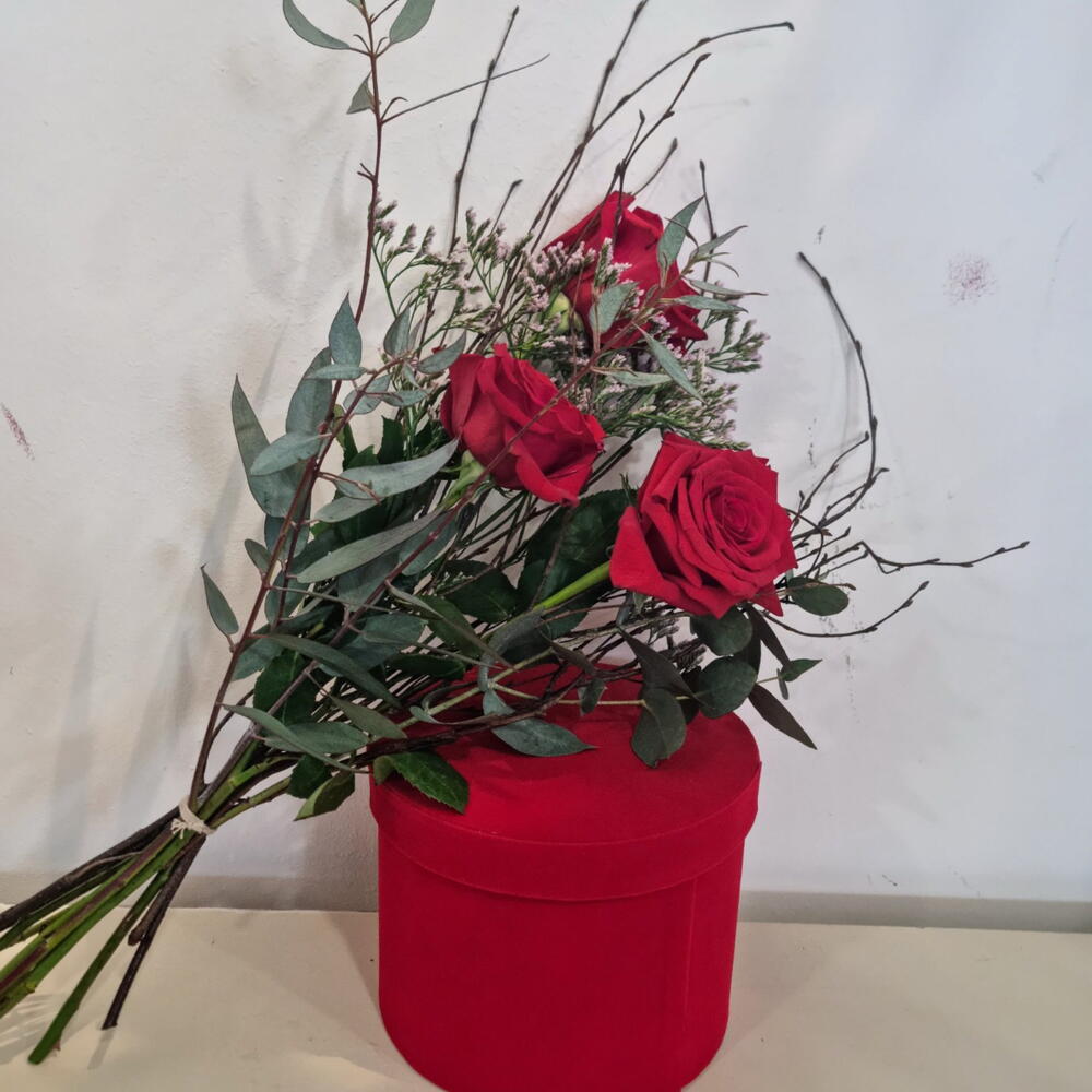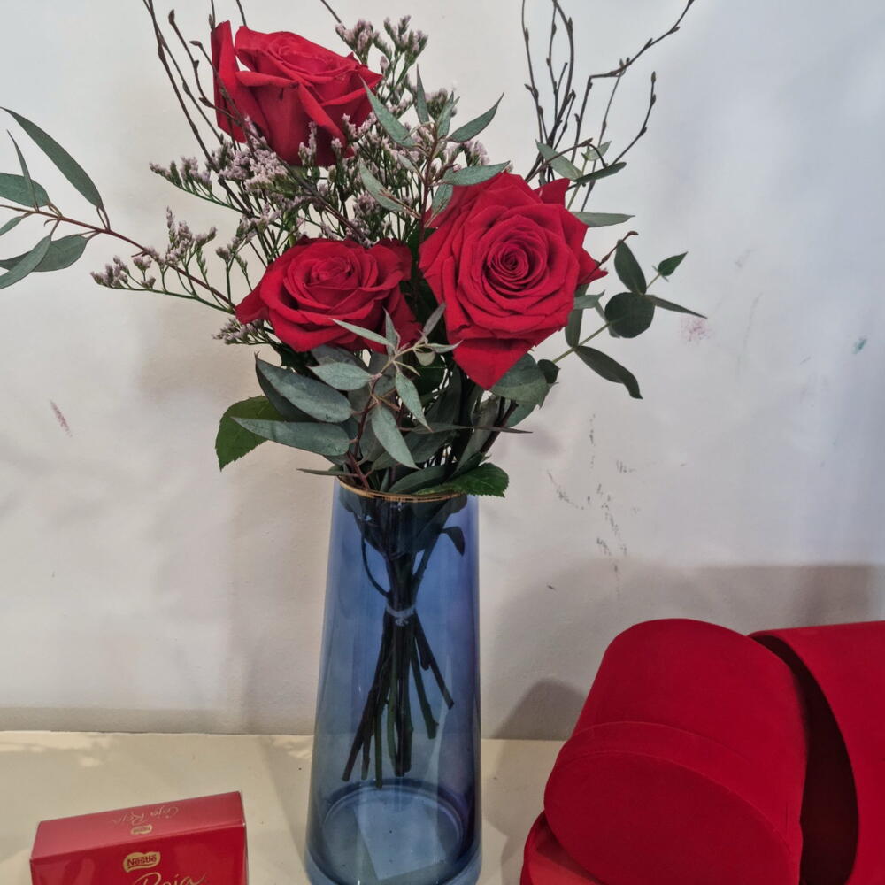 rosas rojas - 3 ud. bombones - 1 ud. verdes decorativos - 3 ud. ramas decorativas naturales - 2 ud. limonium flor de relleno - 1 ud.