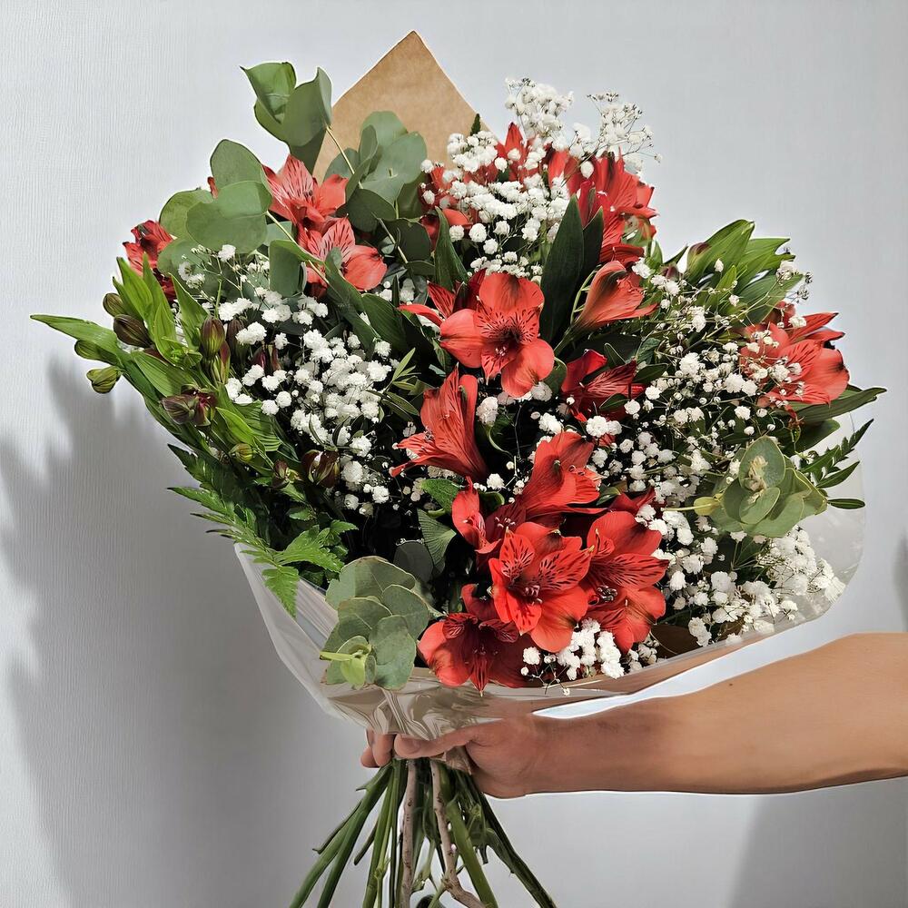 Un impresionante ramo lleno de vitalidad y romanticismo, compuesto por delicadas alstroemerias rojas y un toque de elegancia gracias a la gypsophila blanca. Este arreglo está complementado con hojas verdes y eucalipto, lo que añade frescura y equilibrio al diseño. Perfecto para expresar amor y admiración en cualquier ocasión especial.