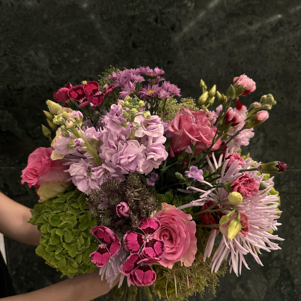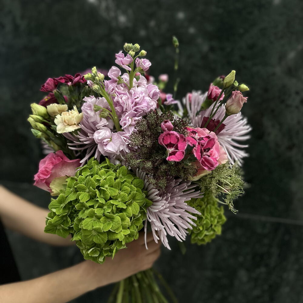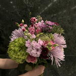 Un ramo delicado y romántico que evoca la frescura de un jardín en plena floración. La combinación de tonos rosados suaves, verdes vibrantes y matices burdeos crea una armonía elegante y natural. Las flores aportan textura y movimiento, mientras que los detalles verdes añaden un toque de frescura y equilibrio. Ideal para expresar ternura, cariño y alegría en cualquier ocasión especial.