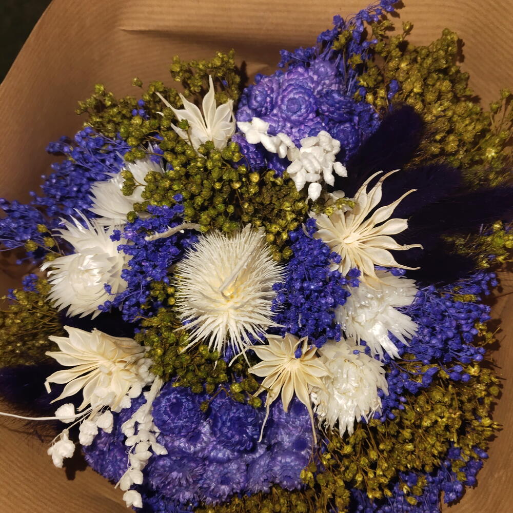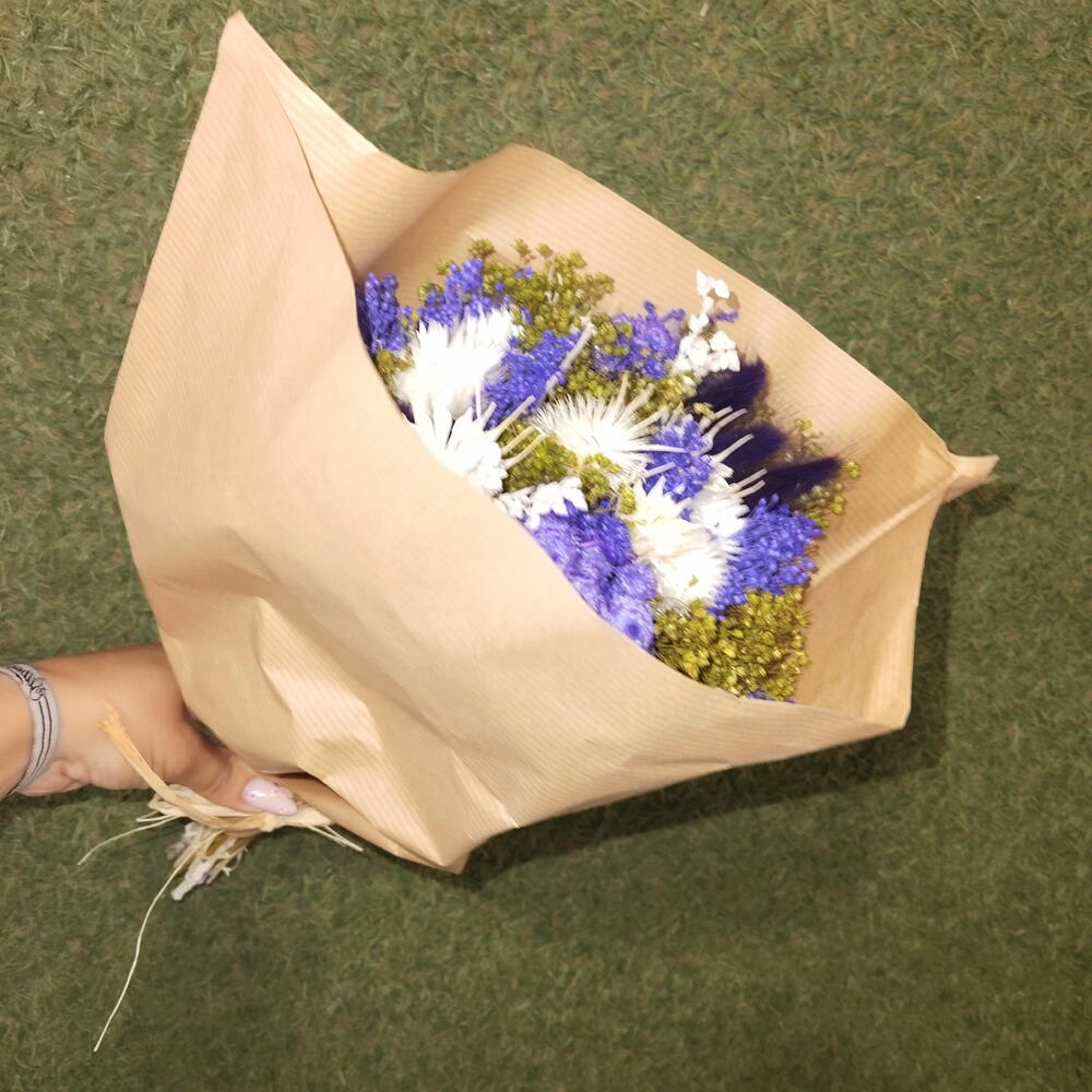 papel kraft - 1 ud. paniculata azul - 12 ud. paniculata verde - 7 ud. flor tipo estrella blanca - 5 ud.