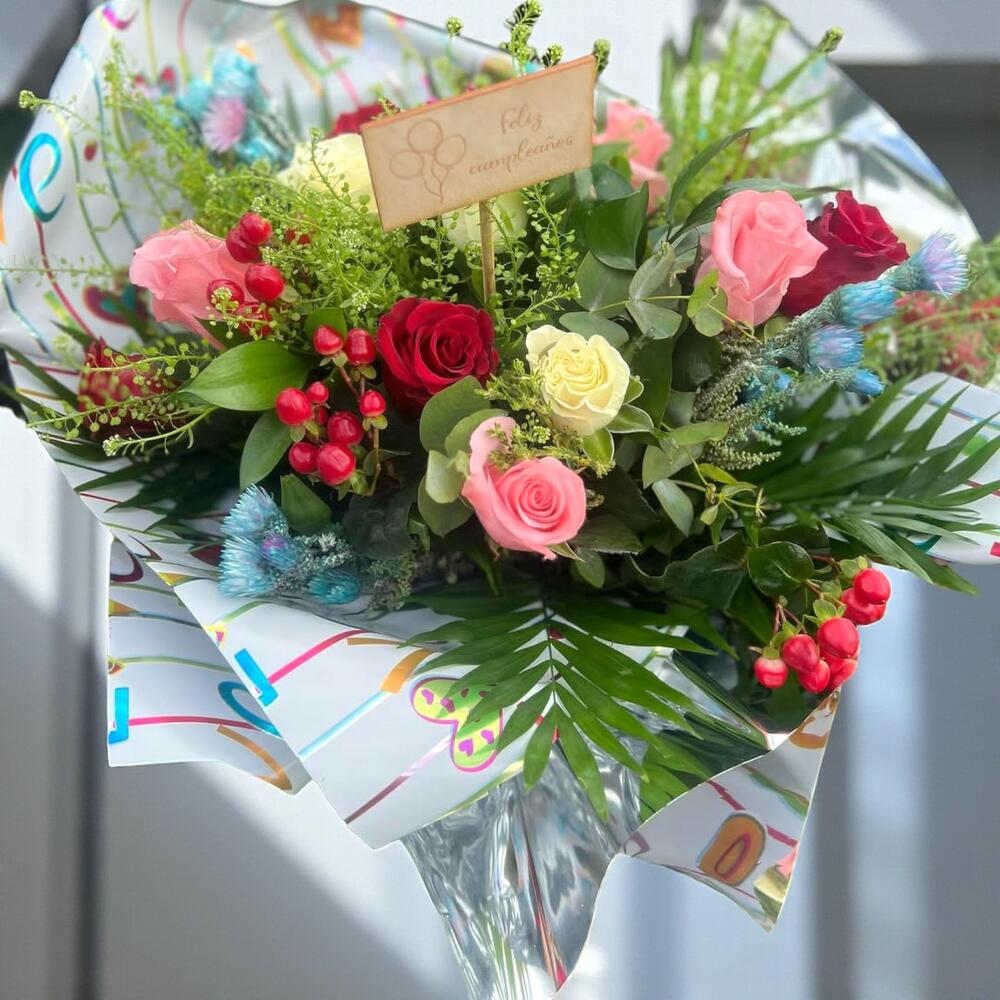 Este colorido ramo de cumpleaños es pura alegría y frescura. Combina rosas en tonos rojo, rosa y crema, junto con frutos decorativos rojos y toques de flores azules, creando una composición llena de vida. Envuelto en un papel festivo con corazones y lazo rosa, transmite cariño y celebración en cada detalle. Para que se conserve hermoso, colócalo en un jarrón con agua fresca, evita el sol directo y renueva el agua cada dos días para mantener la vitalidad de las flores.