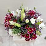 lisianthus blanco - 2 ud. lilium oriental blanco - 2 ud. limonium morado - 20 ud. margarita arlequín roja con centro verde - 3 ud.