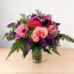 Un bouquet vibrante y lleno de vida, ideal para alegrar cualquier día especial. Los tonos rosados y morados se combinan en perfecta armonía, evocando energía y ternura. Perfecto para ocasiones como cumpleaños, aniversarios o simplemente para sorprender a alguien con un gesto lleno de color y amor.