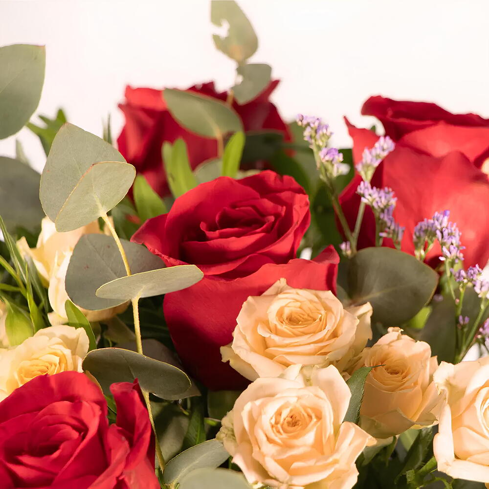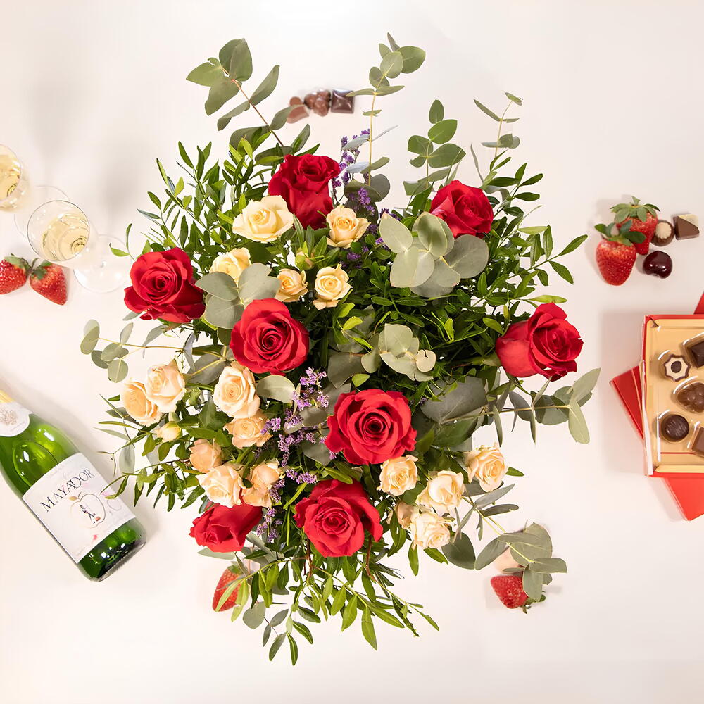 Ruscus - 6 ud. Limonium - 2 ud. eucalipto - 6 ud. rosas rojas - 8 ud. rosas spray crema - 4 ud.