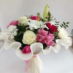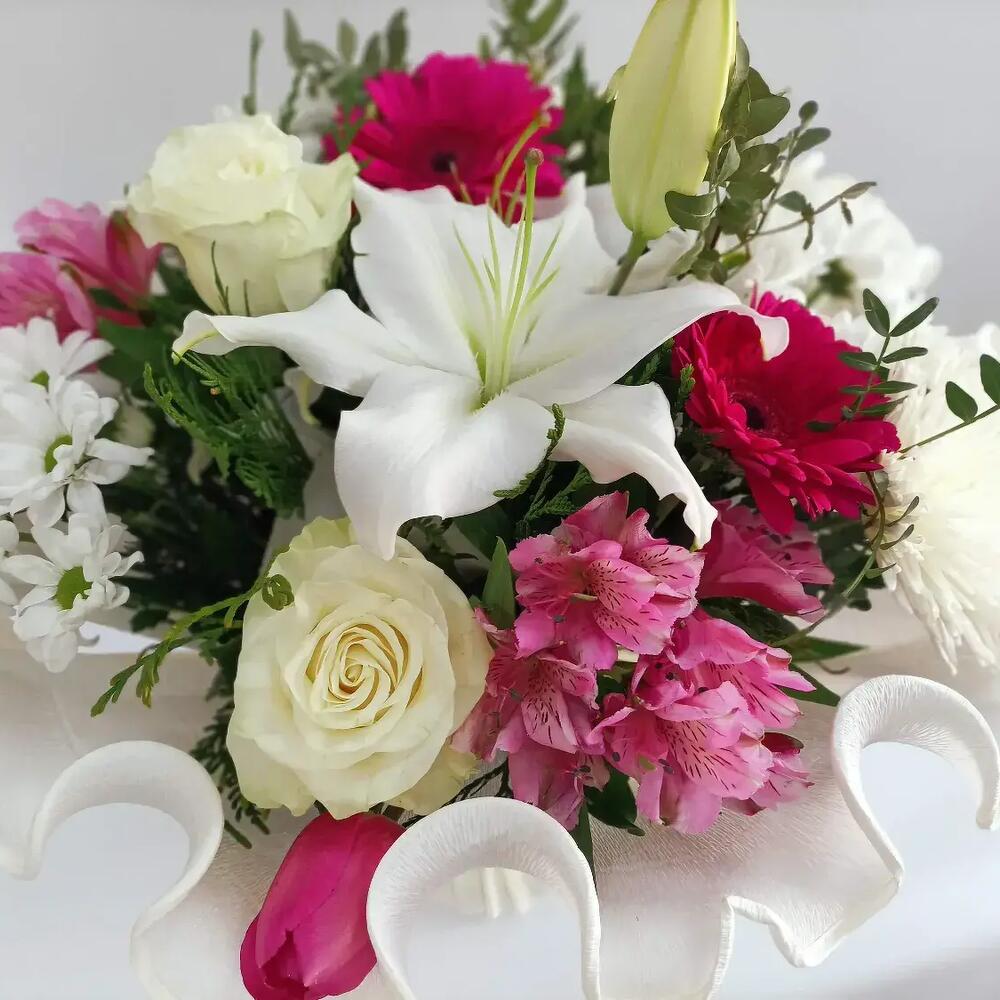 lilium oriental blanco - 1 ud. margarita blanca - 1 ud. margarita rosada - 2 ud. rosas blancas de importación - 3 ud. gerbera rosa o blanca - 1 ud. alstroemerea - 2 ud.