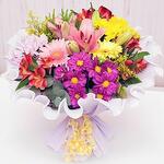 lilium rosado - 3 ud. solidago amarillo - 3 ud. Gerbera rosadas o naranjas - 3 ud. margaritas moradas y blancas - 5 ud. astromelias multicolor - 4 ud.