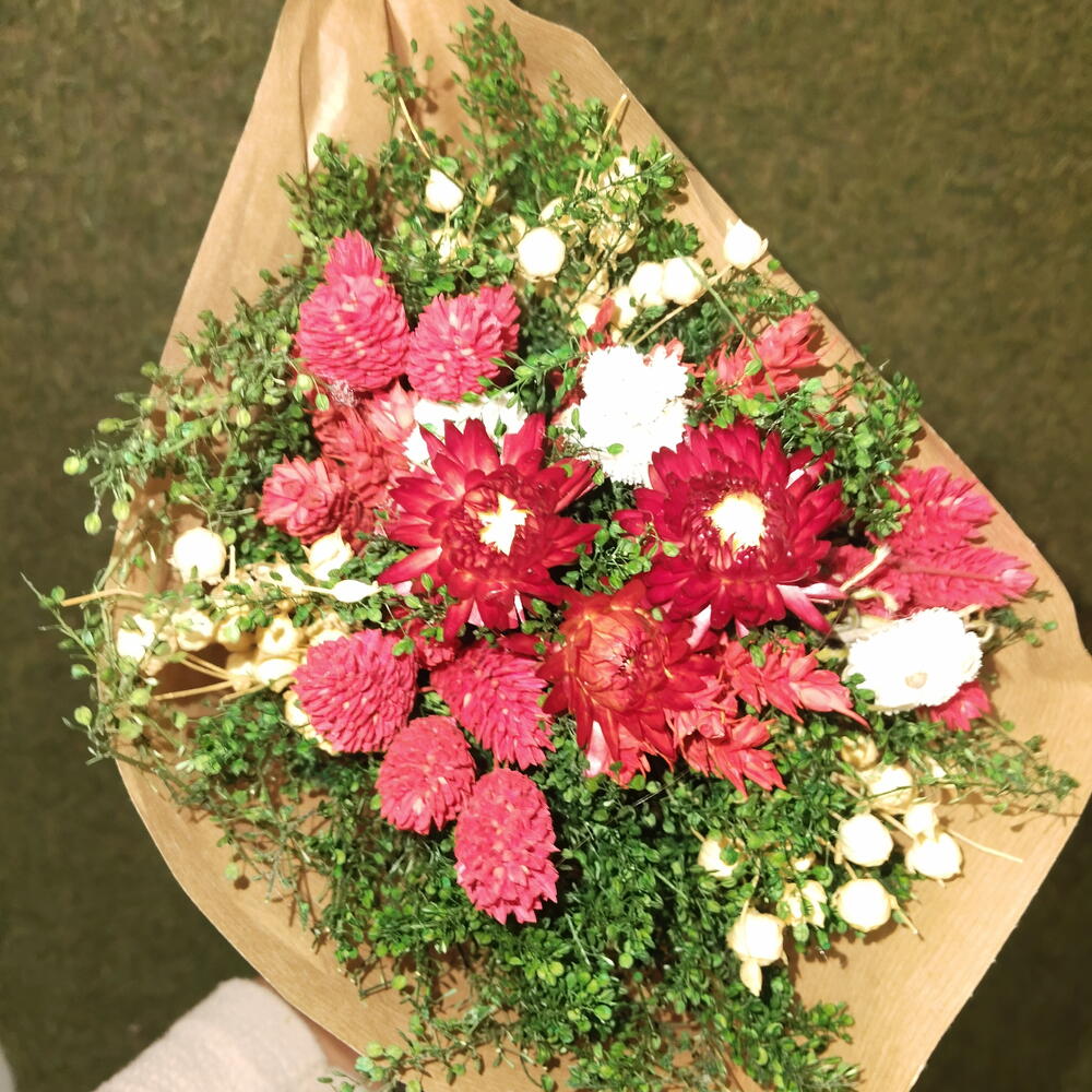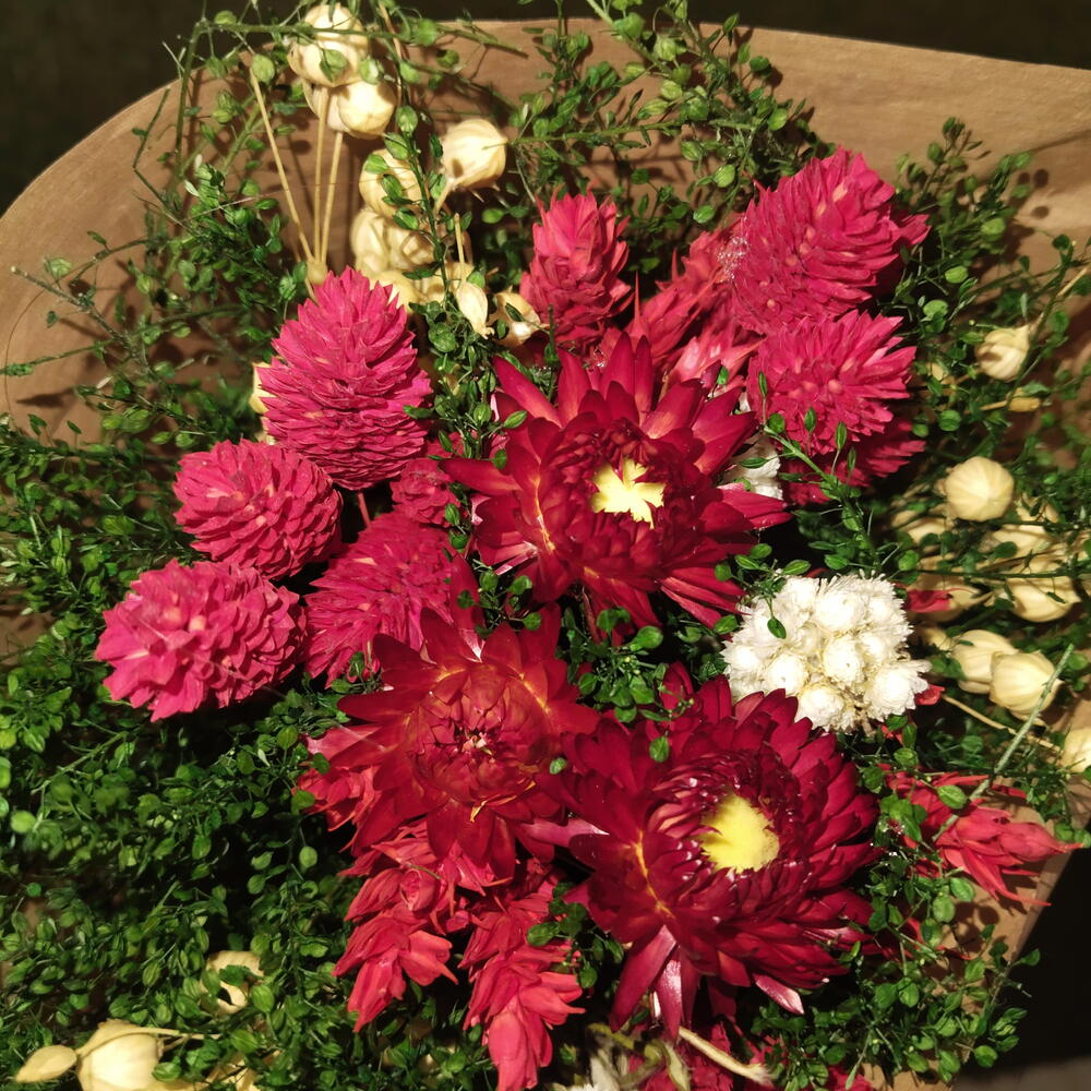 phalaris - 6 ud. verdes variados - 20 ud. flores secas rojas - 2 ud. gompherena roja - 13 ud.