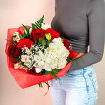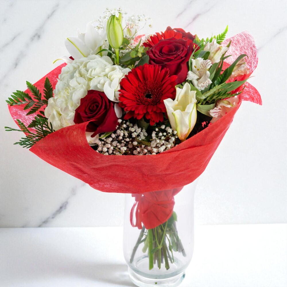 Ramo Flores Sevilla, confeccionado con preciosas flores como son la hortensia blanca, rosas rojas, gerberas rojas y lilium blanco y decorado con elegantes verdes que realzan todavía más la belleza de las flores blancas. Sin duda, un ramo de flores de regalo, especial para una ocasión especial, como puede ser dar la bienvenida a un bebé, regalar a una novia, o bien simplemente por el deleite de las flores blancas, muy apreciadas por la dulzura e inocencia que inspiran