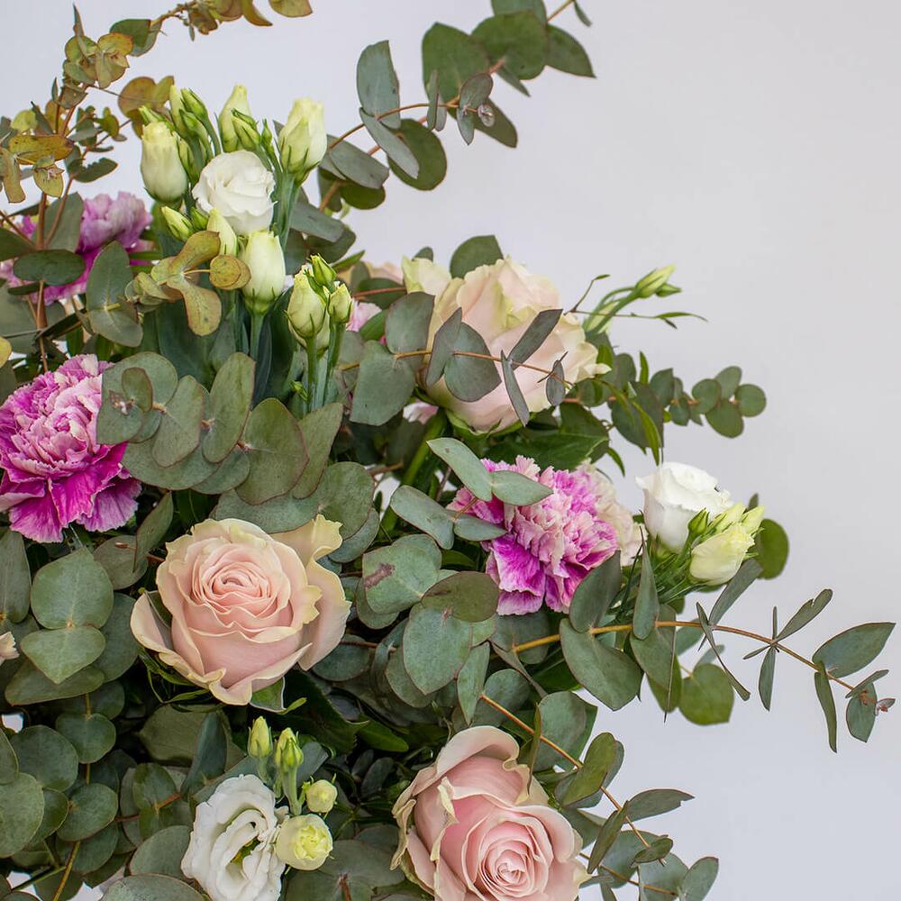 Lisianthus - 3 ud. rosas - 5 ud. claveles - 7 ud. verdes variados - 5 ud.