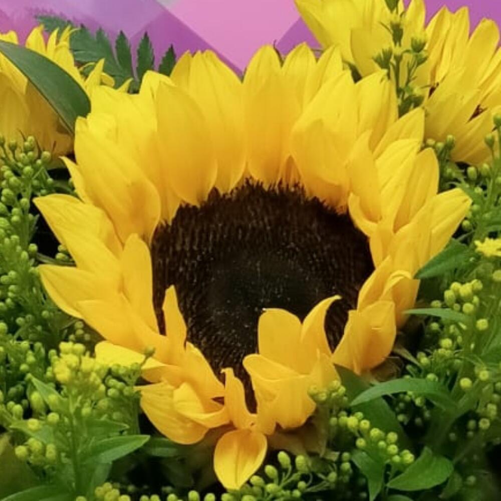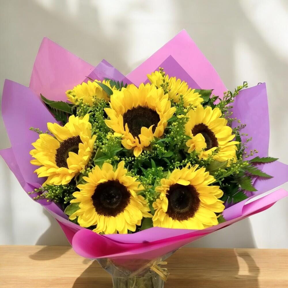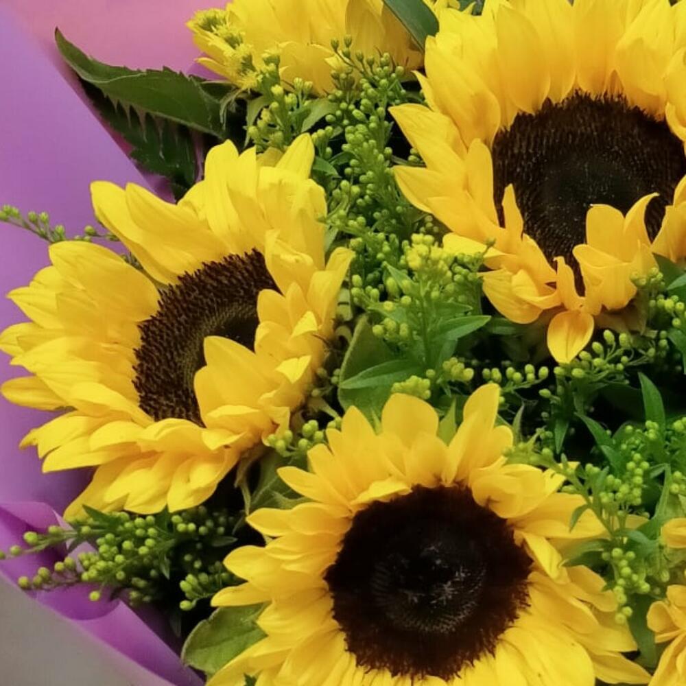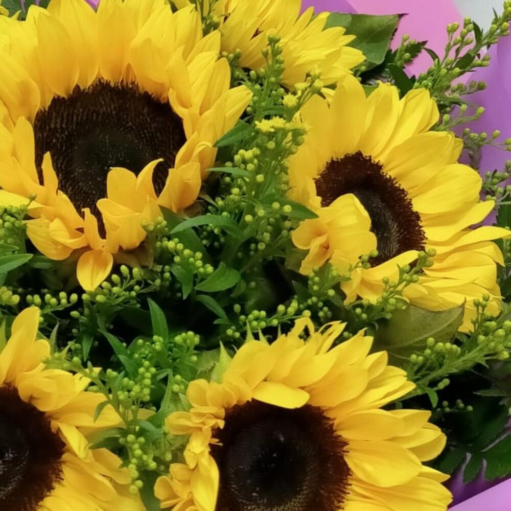 Este hermoso ramo clásico es una exquisita combinación de 7 girasoles resplandecientes, enmarcados con 4 tallos de Solidago que agregan un toque vibrante de color. Los 4 verdes variados de temporada proporcionan un marco ideal para las flores, dando un equilibrio perfecto entre color y textura. Cada ramo viene con 2 envoltorios decorativos que proporcionan un acabado elegante y refinado. Un regalo perfecto para cualquier ocasión.