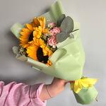 eucalipto - 1 ud. cinta de raso - 1 ud. girasol - 2 ud. clavel - 3 ud. embalaje de diseño - 1 ud. gibsafila - 2 ud.