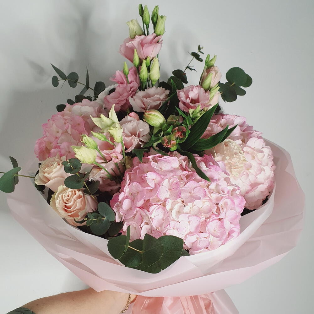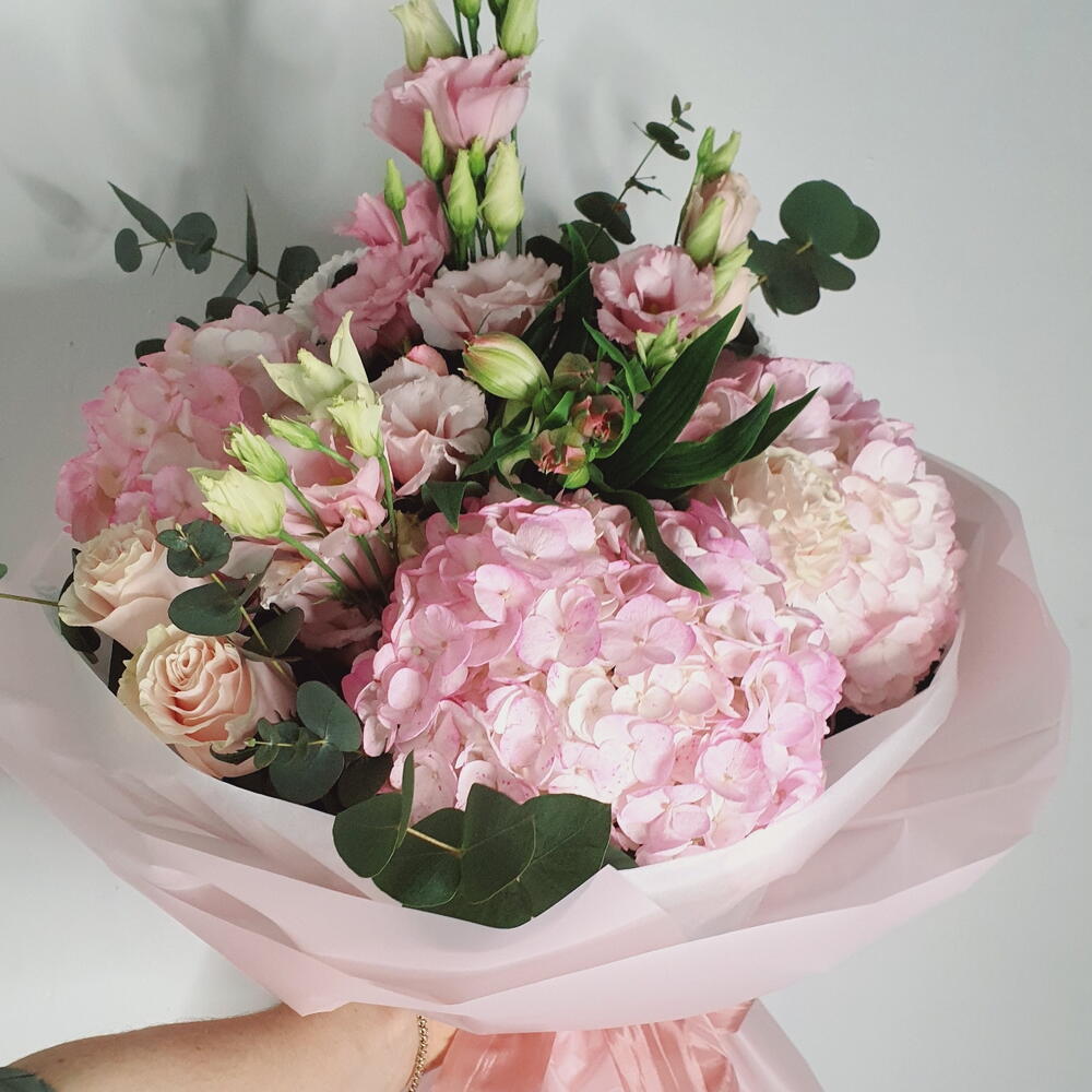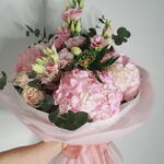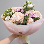 Este elegante ramo combina la delicadeza de hortensias melocotón, crisantemos lilas, eustomas blancas y rosas suaves, creando una armonía de colores pastel. Las hojas de eucalipto aportan frescura y un toque natural, mientras que el papel translúcido en tonos suaves envuelve la composición con gracia. Perfecto para momentos especiales como cumpleaños, aniversarios o simplemente para sorprender a alguien querido.