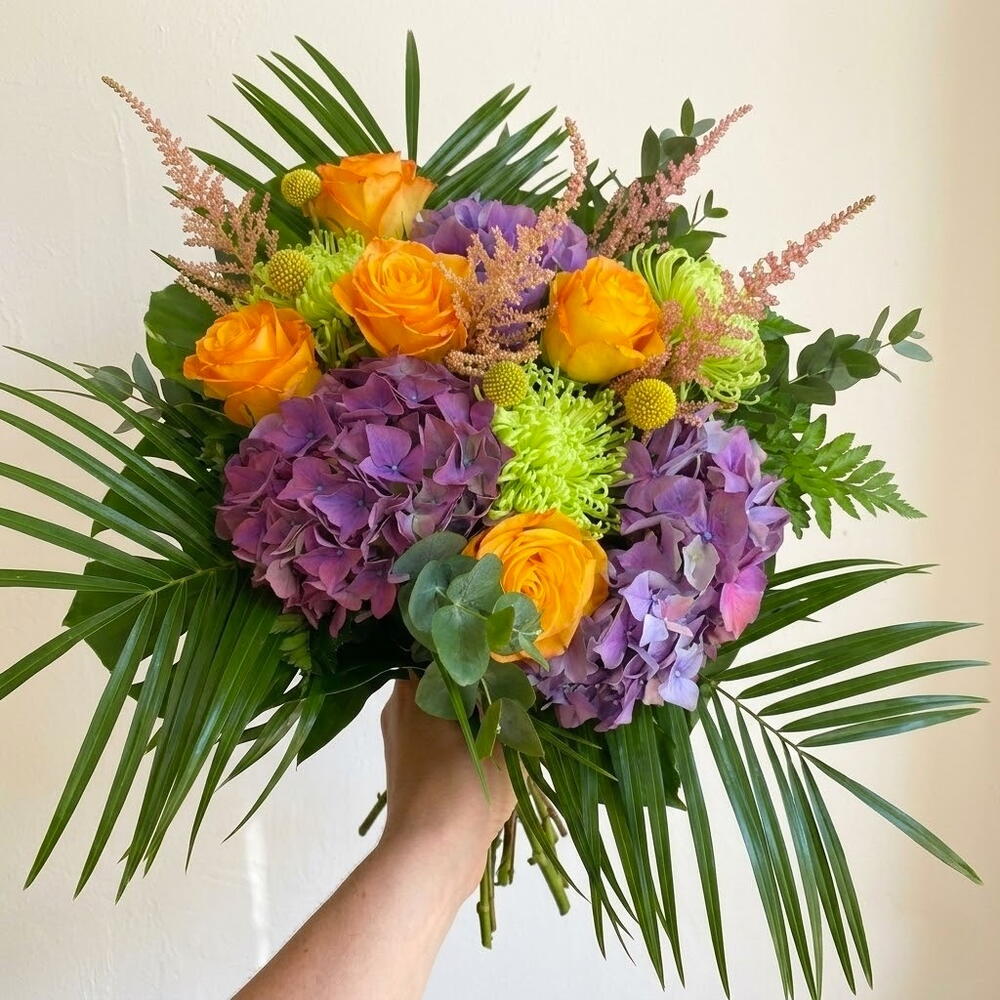 Un elegante y vibrante ramo floral que combina colores intensos y texturas naturales para crear una composición moderna y sofisticada. El arreglo destaca por las espectaculares hortensias en tonos lila, acompañadas de rosas naranjas que aportan calidez y luminosidad. También incluye crisantemos verdes tipo spider, delicadas astilbes rosadas y pequeños craspedias que añaden textura y dinamismo al diseño. El conjunto se completa con eucalipto y hojas de palma decorativa, creando un contraste natural que realza la belleza de las flores. Este ramo es perfecto para cumpleaños, celebraciones especiales, aniversarios o para regalar un detalle elegante y lleno de color. Para conservar el ramo fresco durante más tiempo, se recomienda cortar los tallos en diagonal antes de colocarlos en un jarrón con agua limpia. Cambiar el agua cada dos días y mantener el ramo en un lugar fresco con luz indirecta, evitando el sol directo y las fuentes de calor. También es aconsejable retirar las hojas que queden dentro del agua para evitar bacterias.