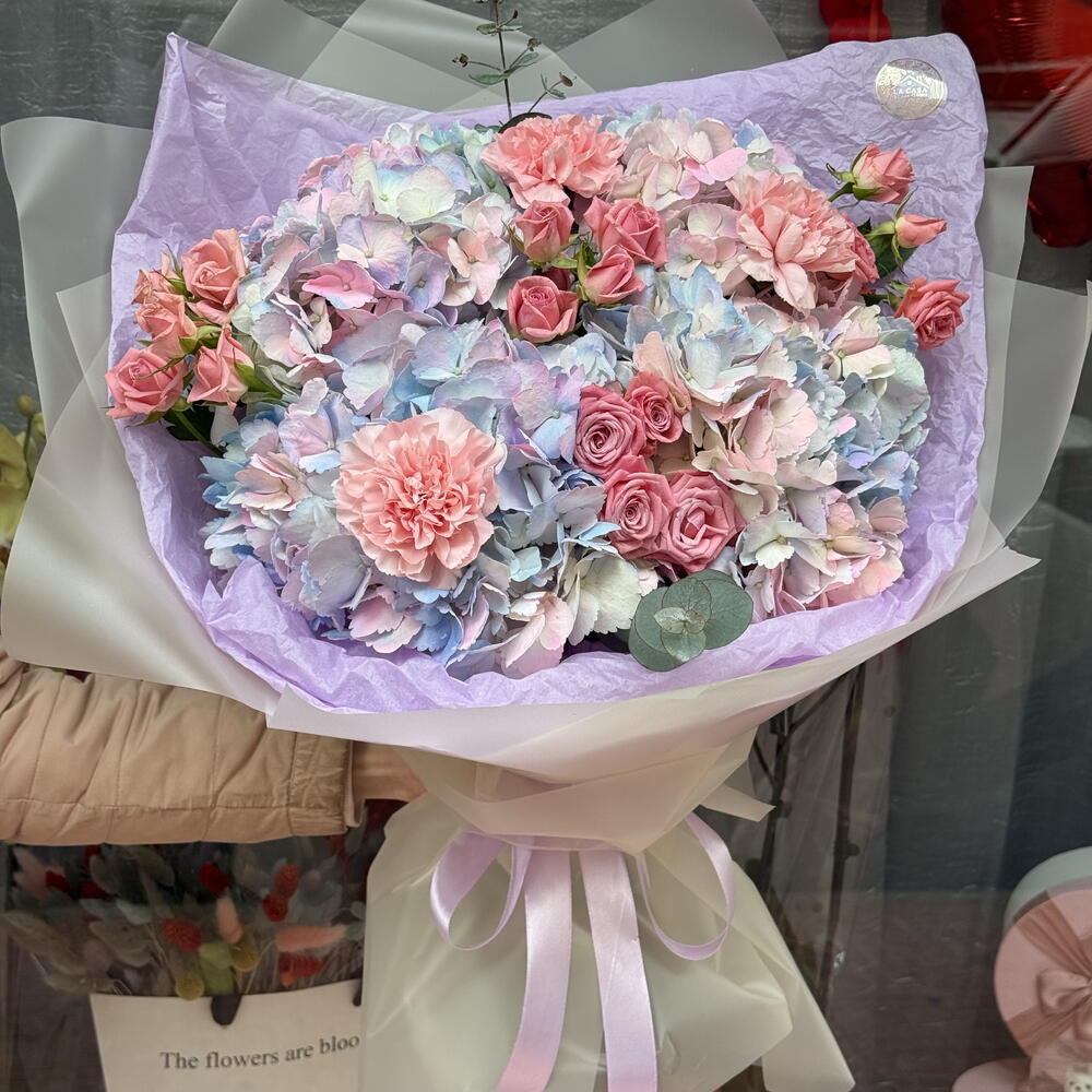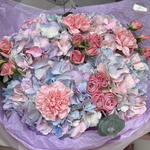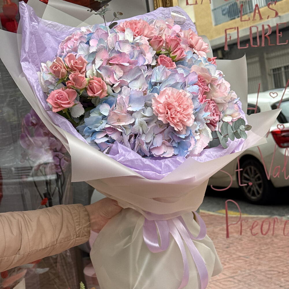 Eucalyptus - 3 ud. Spray rose - 4 ud. clavel columbiano - 3 ud. hortensia malvavisco - 4 ud.
