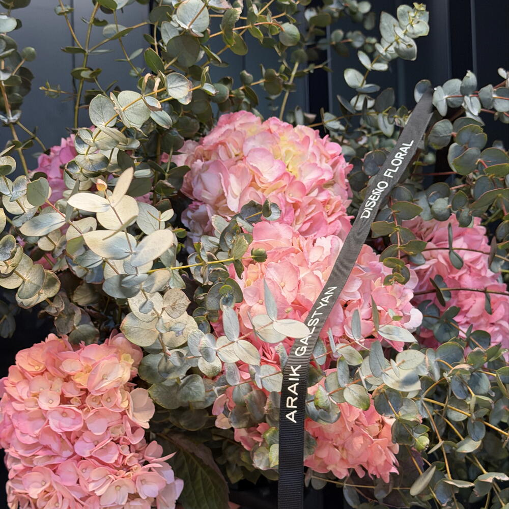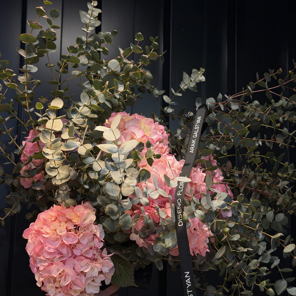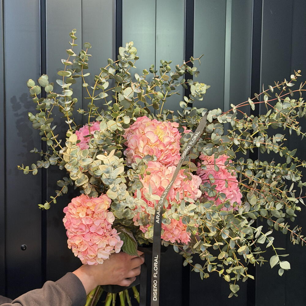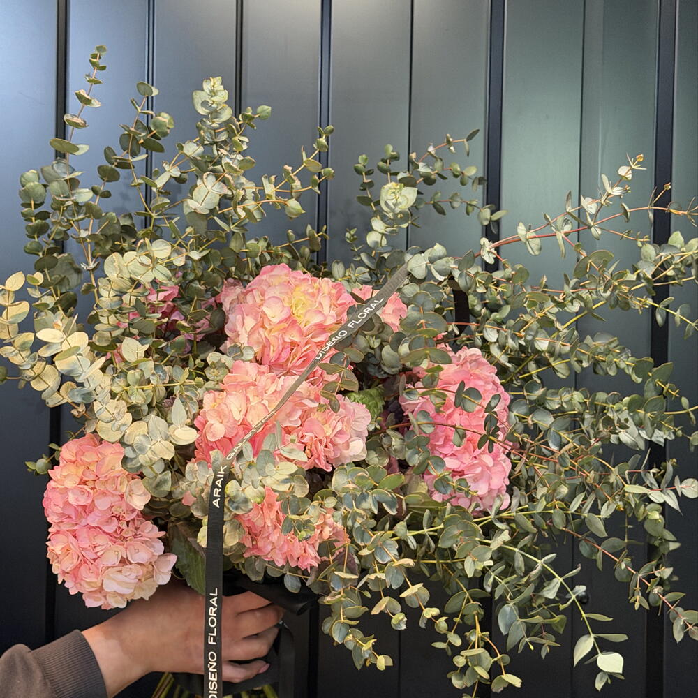 Bouquet premium compuesto exclusivamente por hortensias seleccionadas en tonos rosadas, azul y burdeos. Un arreglo voluminoso, elegante y sofisticado, ideal para regalos especiales o para decorar espacios con un toque de lujo. Su estructura artesanal y su mezcla de colores profundos crean un bouquet imponente y atemporal.