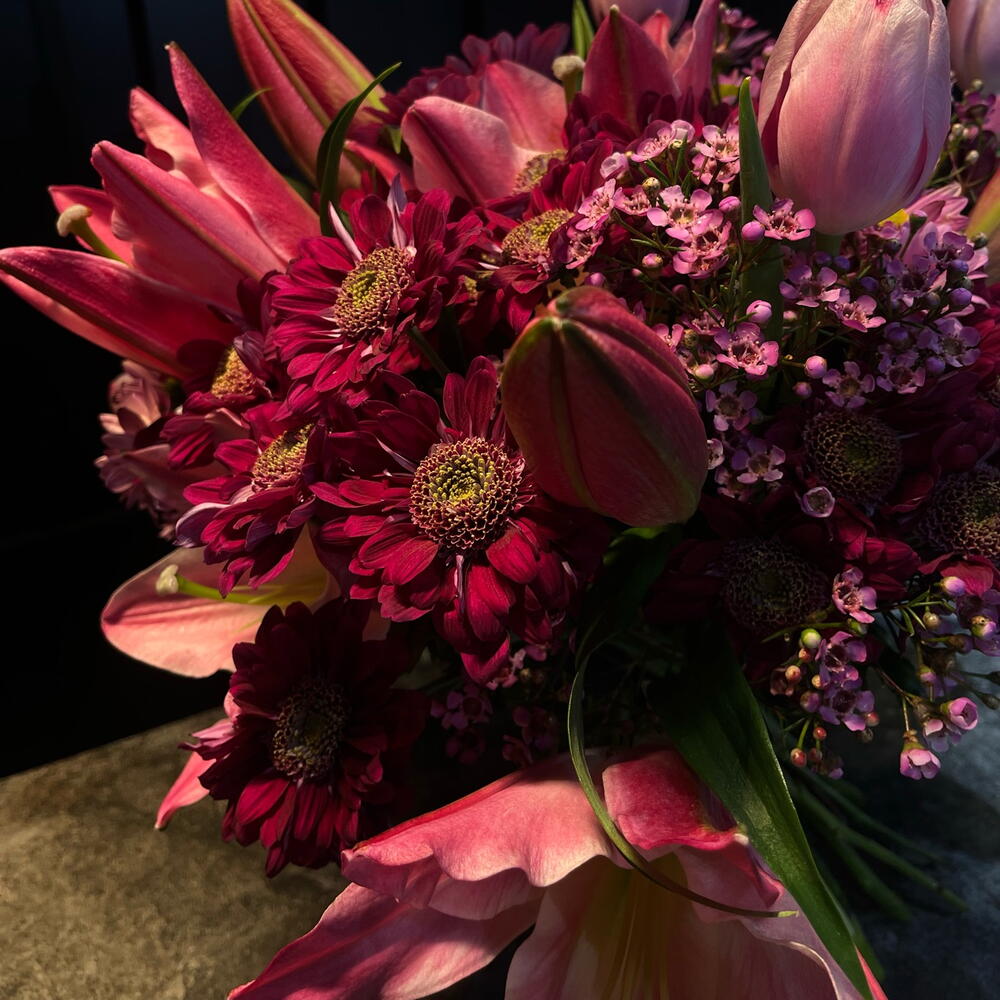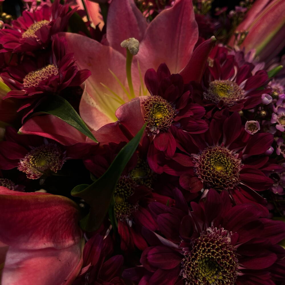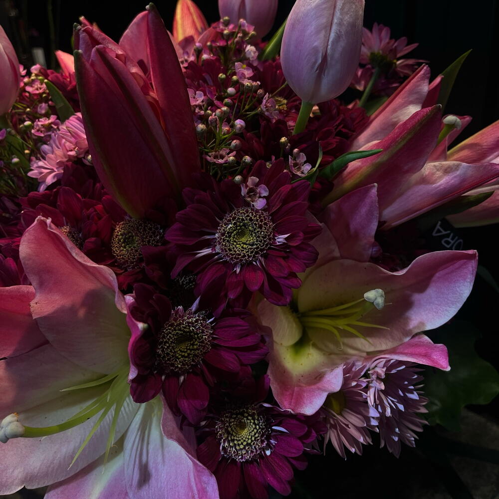 Ramo de liliums y crisantemos rosadas
