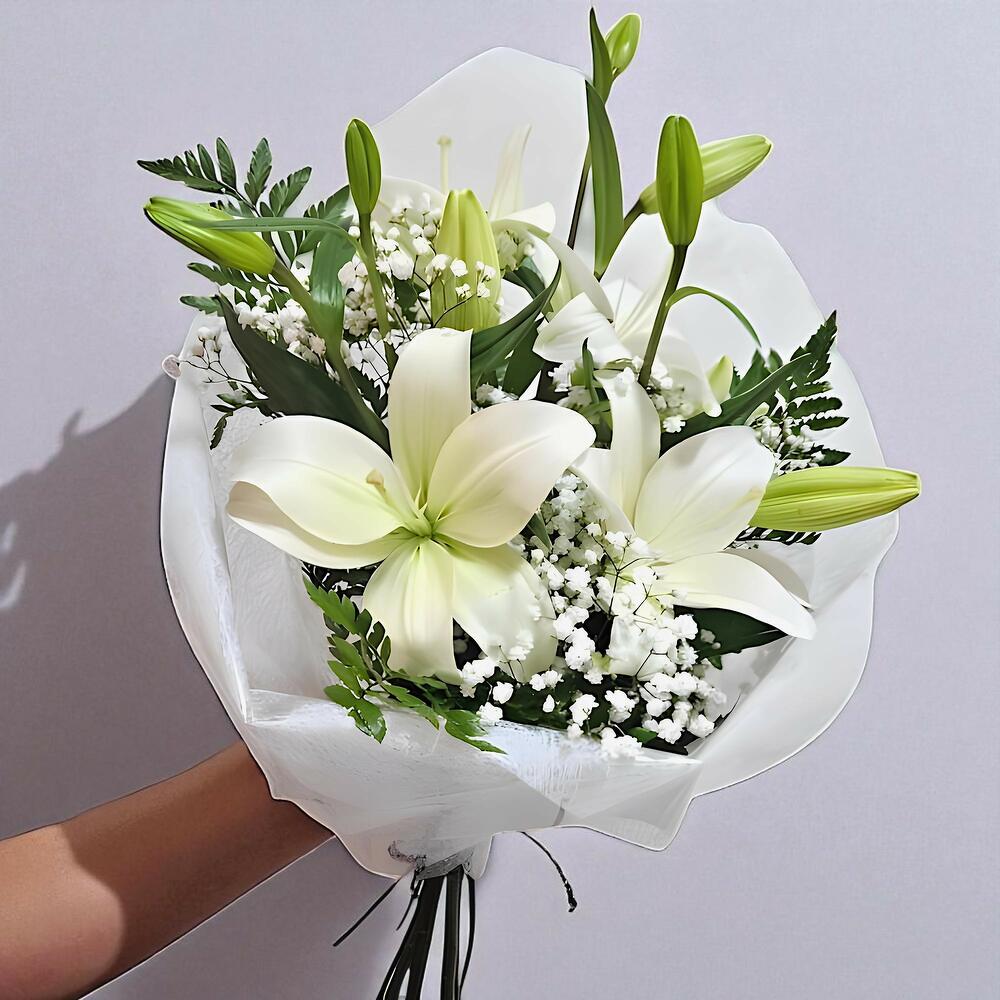 Un bouquet elegante y clásico que destaca por la pureza y frescura de las flores blancas. Compuesto por lirios blancos y delicado gypsophila, está acompañado de follaje verde que resalta su belleza natural. Envuelto con papel decorativo blanco, es una elección perfecta para transmitir sentimientos de paz y admiración. Ideal para ocasiones especiales o para alegrar el día de alguien especial.