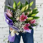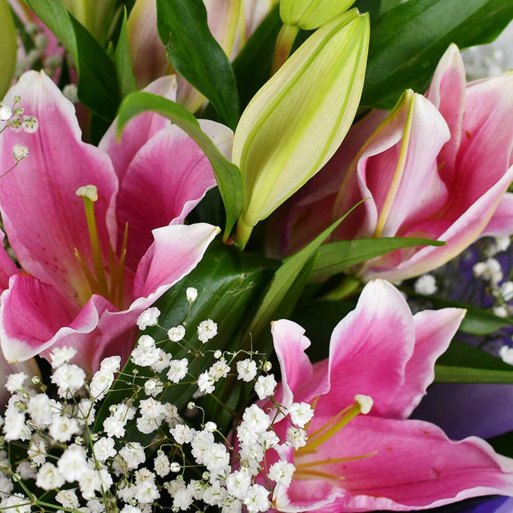 Este ramo es una verdadera encarnación de la elegancia y el color. Tres lirios rosados de gran tamaño se abren entre la delicada nube de gypsophila, creando una sensación de ligereza y gracia. El empaque de diseño en color violeta resalta los tonos intensos y hace que el arreglo sea especialmente llamativo. Una elección perfecta para sorprender a alguien especial.