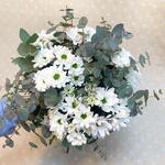Este elegante ramo de margaritas blancas con eucalipto es la definición perfecta de frescura y pureza. Sus delicadas flores blancas, acompañadas de follaje verde grisáceo, crean una combinación armoniosa que aporta calma y serenidad a cualquier espacio. Perfecto para ocasiones especiales como nacimientos, bodas o simplemente para alegrar el día de alguien con un gesto sincero. Su diseño minimalista y natural lo convierte en un detalle versátil para cualquier entorno, desde hogares modernos hasta decoraciones clásicas.