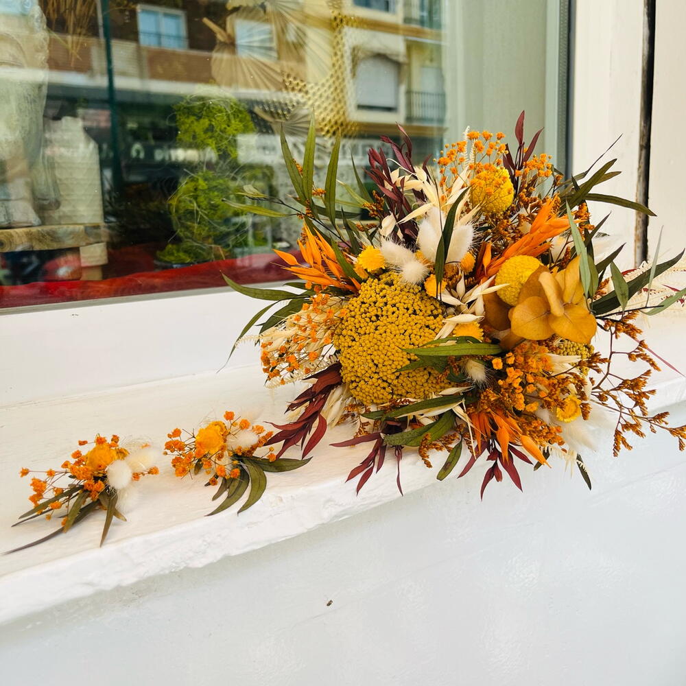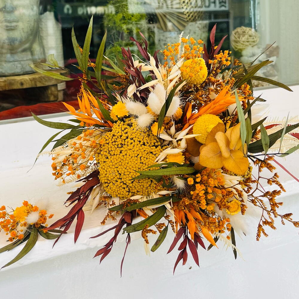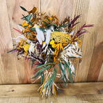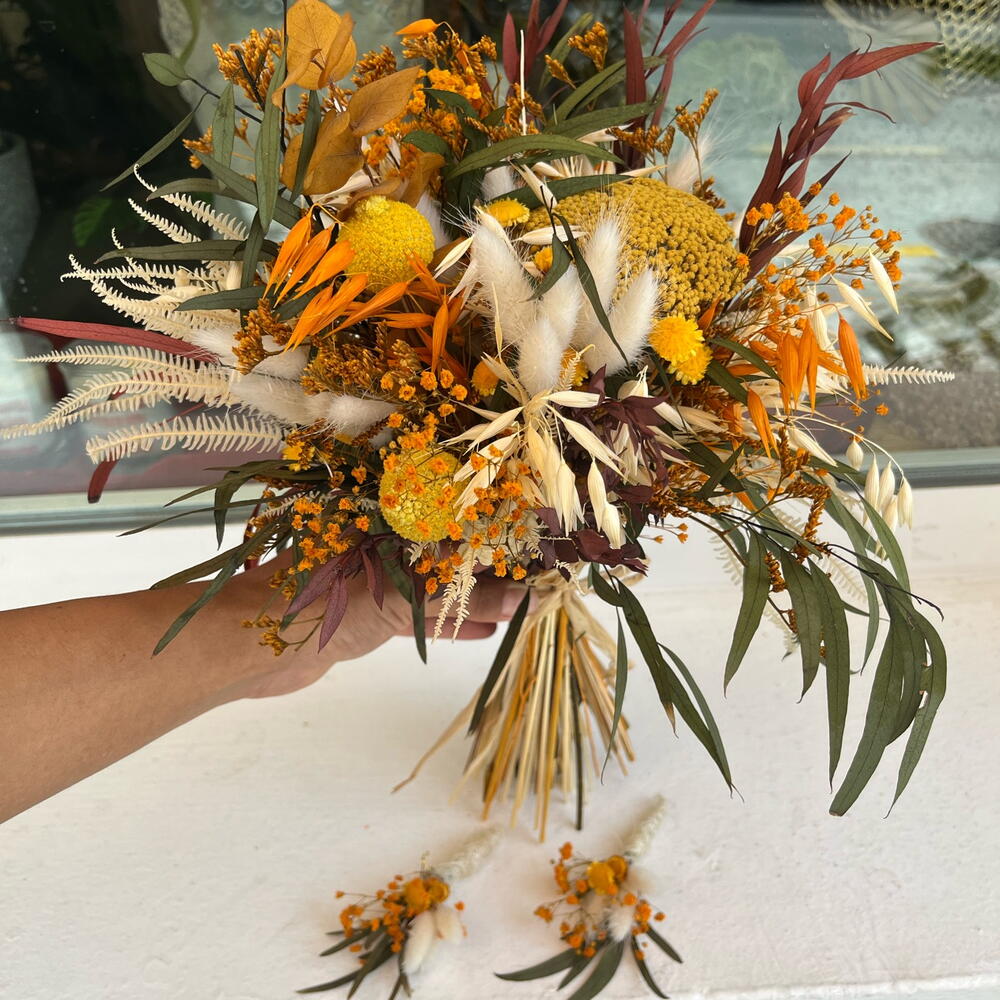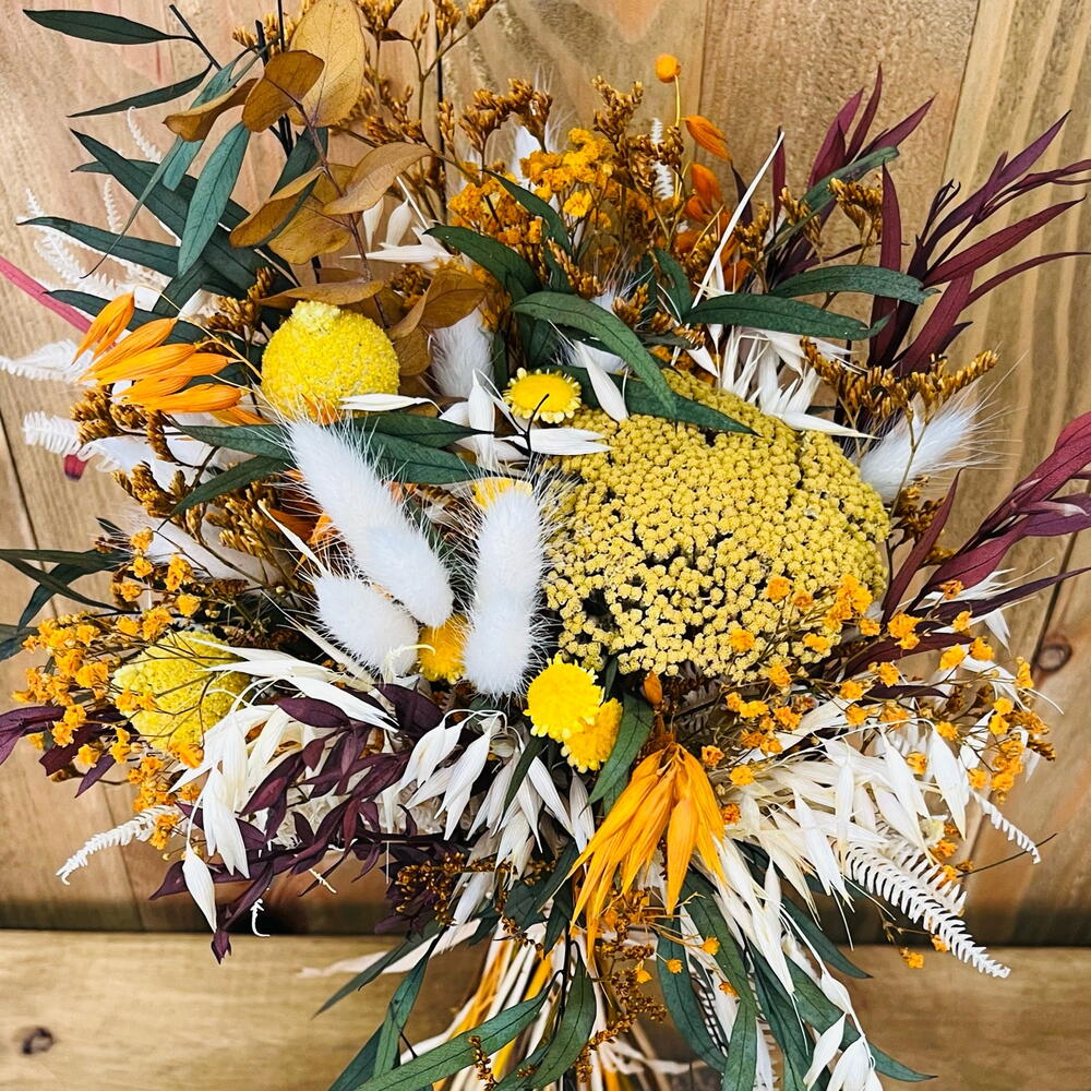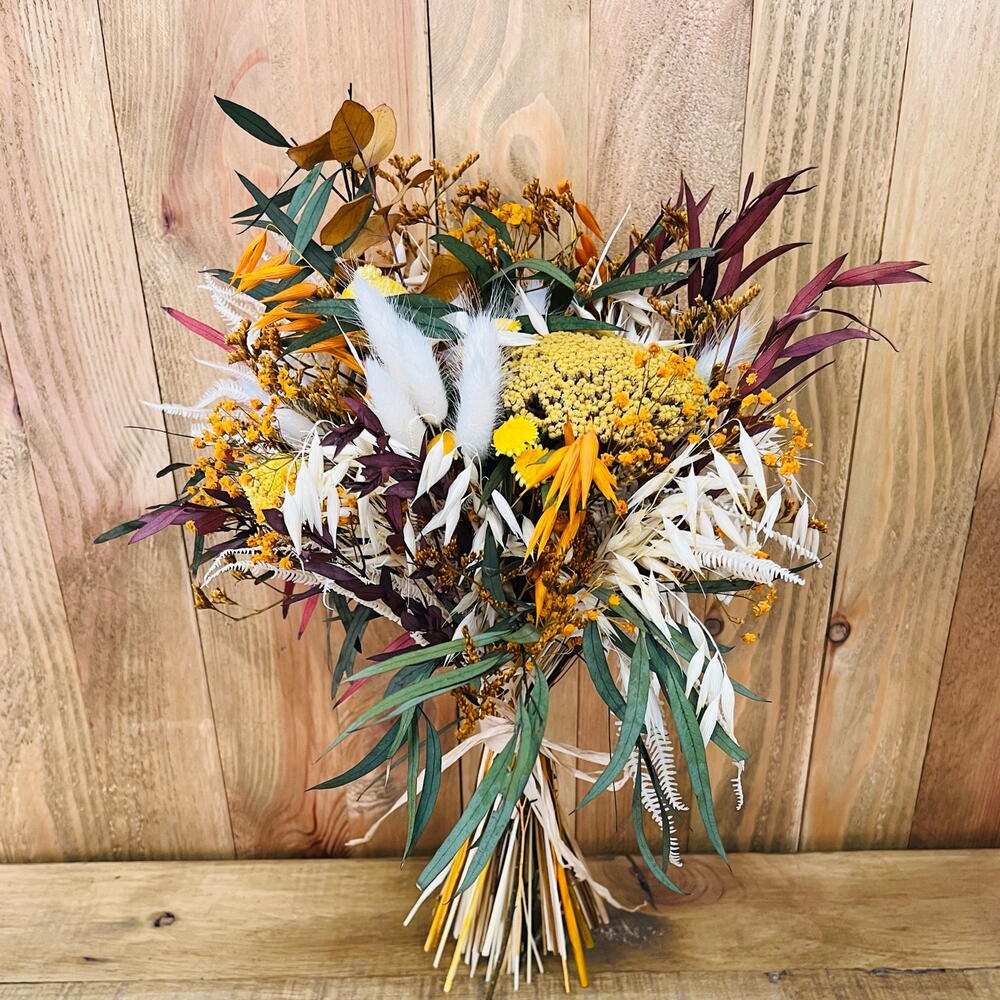 Ramo Sevilla variado de flores preservadas en estilo silvestre en tonos otoñales con variedades de eucaliptos, paniculata, achillea, avena, craspedia, margaret y helecho. En ocasiones las Flores pueden estar sujetas a pequeñas variaciones según temporada, se substituirán por otras similares, respetando los tonos y el estilo de la composición del ramo.