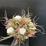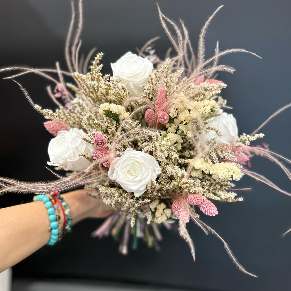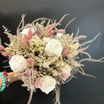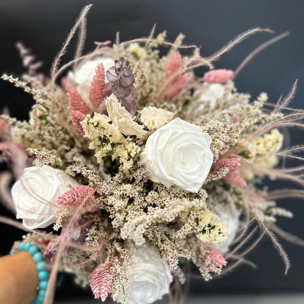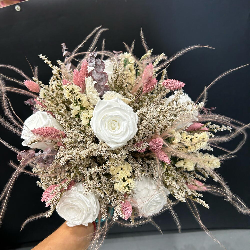 rosa preservada - 6 ud. paniculata seca - 3 ud. pampa seca - 4 ud. ruscus rosa seco - 6 ud. follaje seco - 10 ud.