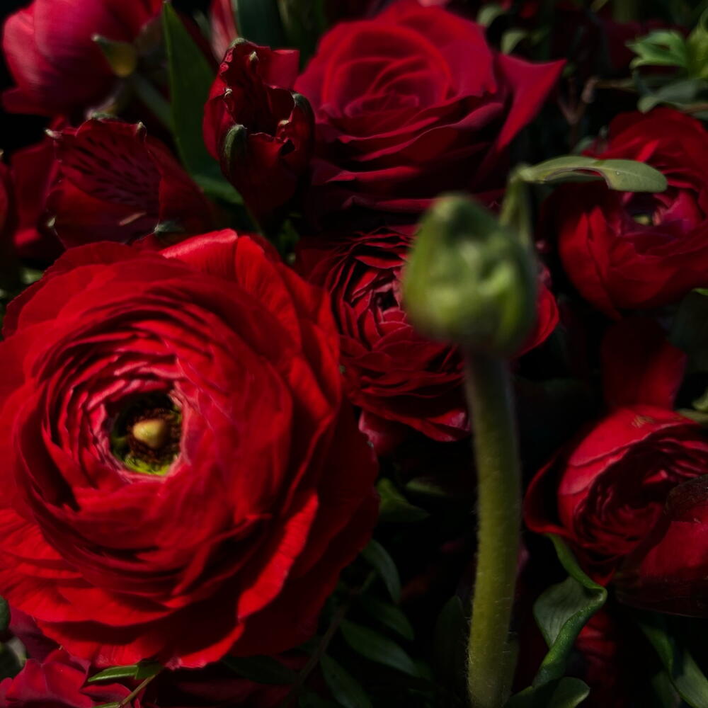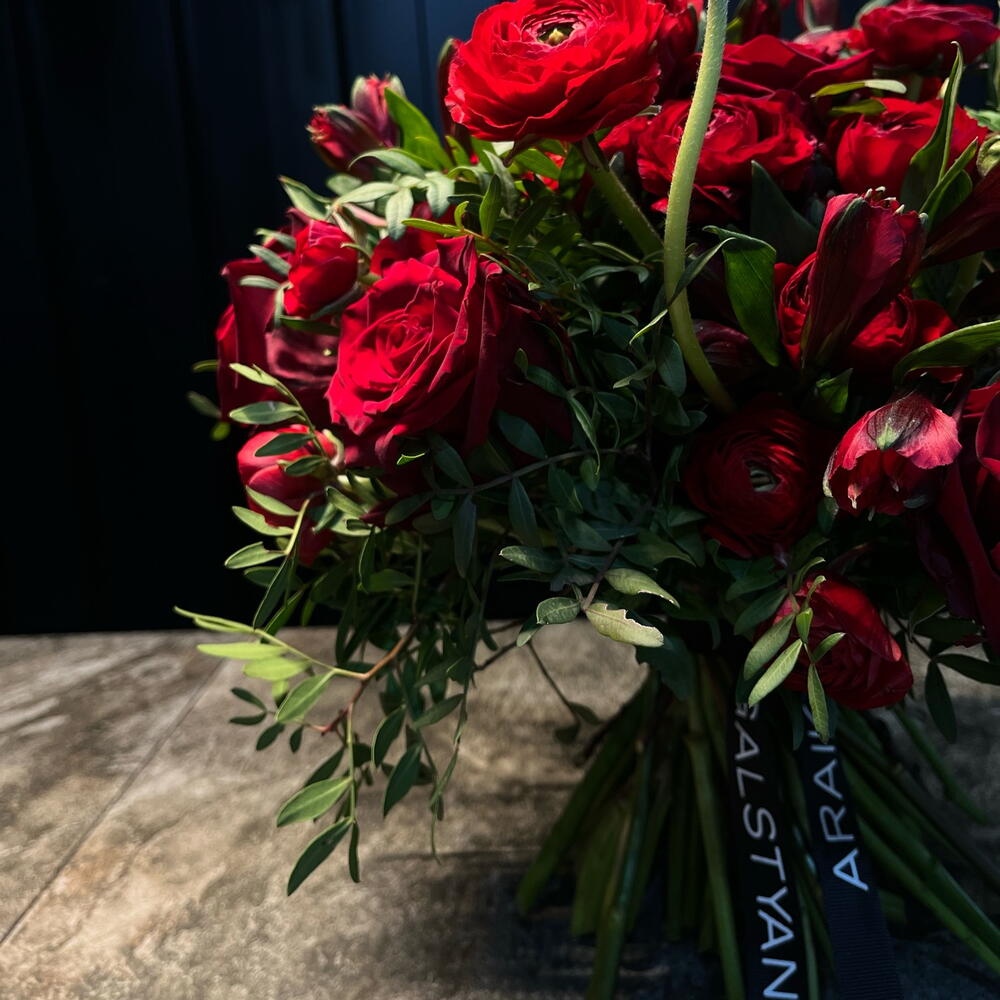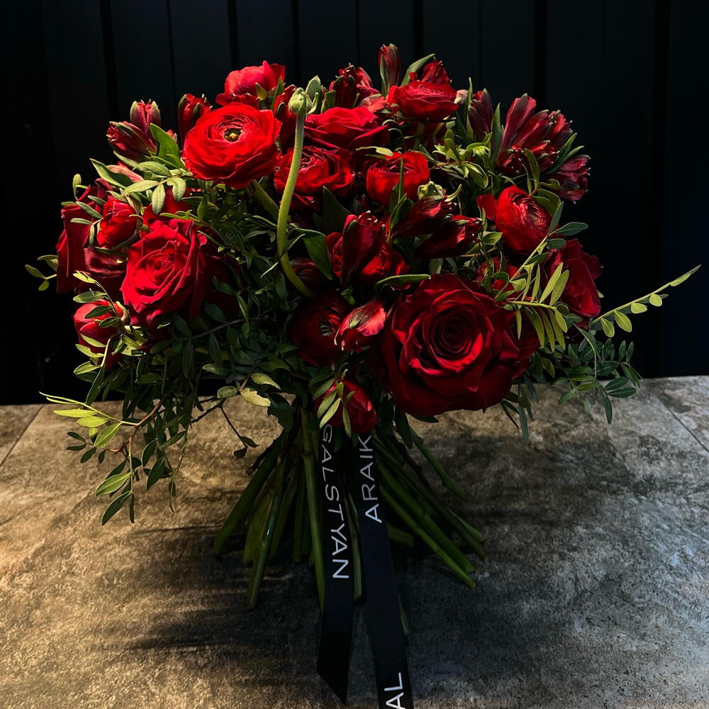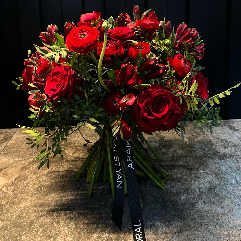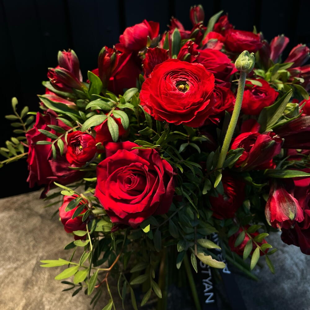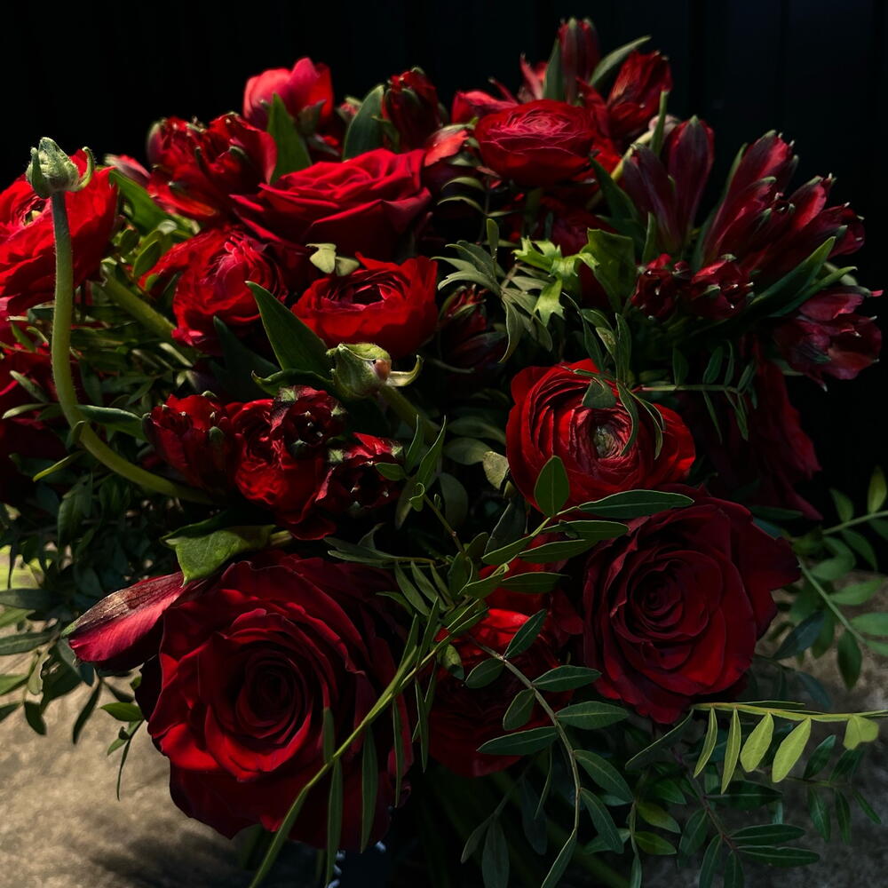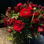 Composición floral elegante y compacta, elaborada principalmente con flores en tonos rojos intensos. Destacan rosas y ranúnculos rojos, combinados con alstroemerias y abundante follaje verde que aporta volumen y frescura. El arreglo tiene una forma redondeada y equilibrada, con un estilo natural pero sofisticado. Ideal para ocasiones especiales, transmite pasión, elegancia y carácter.