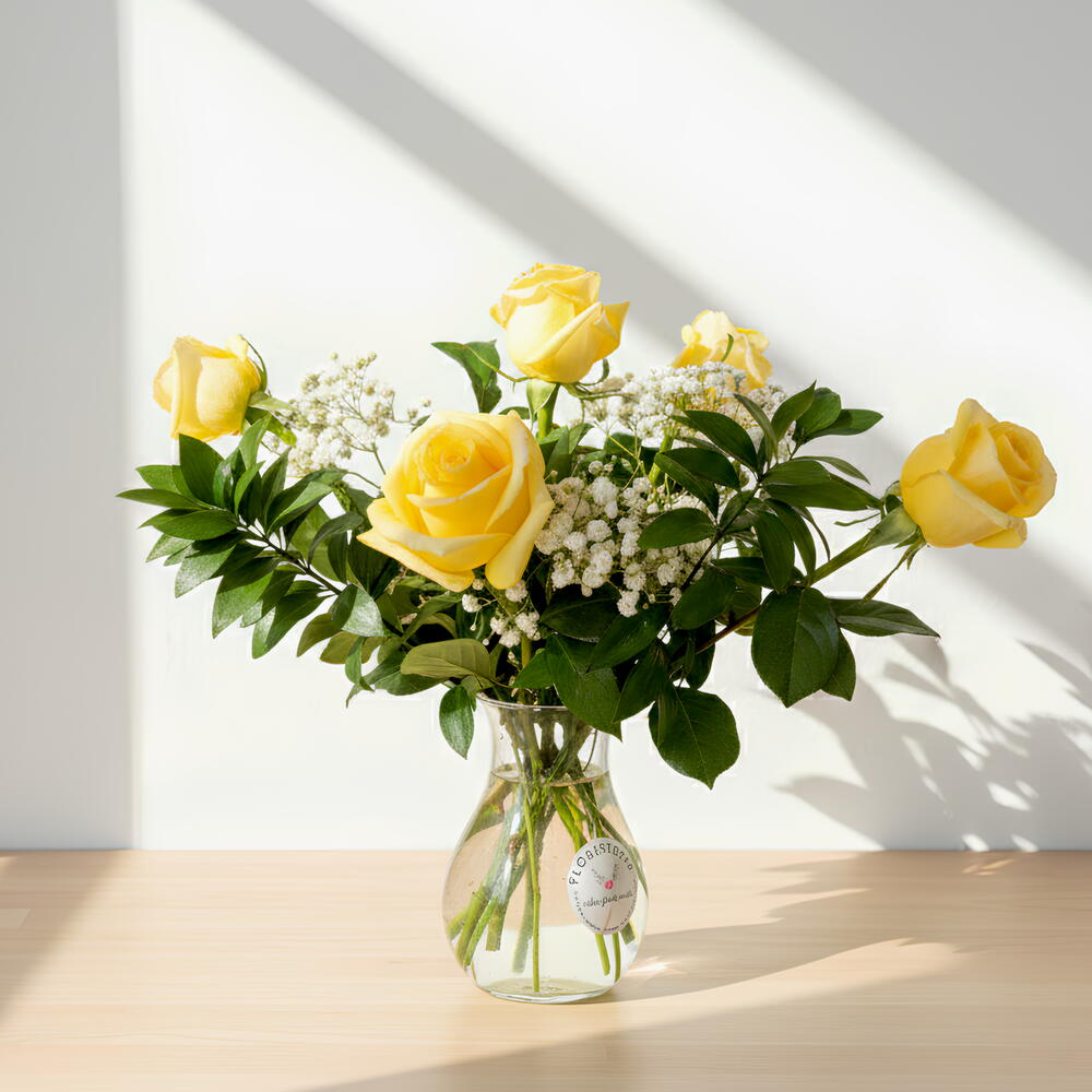 Ruscus - 2 ud. rosas amarillas - 5 ud. jarron - 1 ud. paniculata blanca - 2 ud.