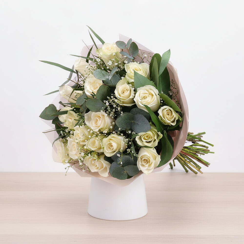 Este elegante ramo, elaborado con rosas blancas, símbolo de elegancia y pureza, es la forma más sencilla e impactante de expresar tus sentimientos. Adornado con frescas rosas blancas, hojas de eucalipto y delicada gypsophila, este arreglo ofrece una pureza deslumbrante. Su empaque en tonos pastel le da un toque romántico y sofisticado. Es la opción perfecta para momentos especiales como bodas, aniversarios, felicitaciones o agradecimientos. Tan encantador en su apariencia como en su aroma, este ramo ofrece una elegancia irresistible. Refleja a la perfección el valor y la dedicación que brindas a tus seres queridos. Haz que cada momento sea inolvidable con este arreglo especial.