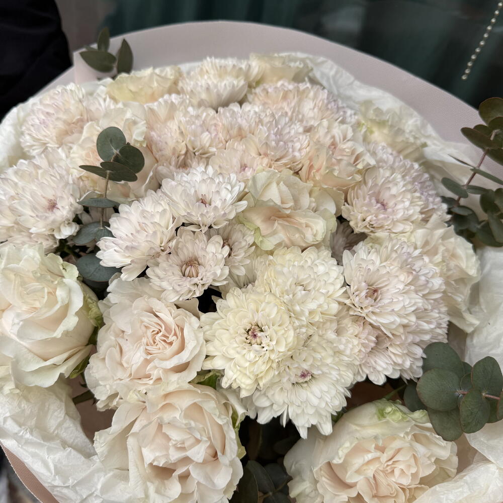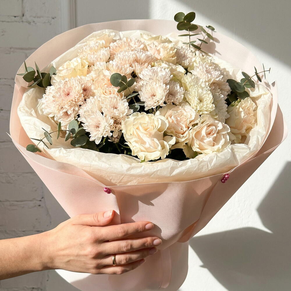Ramo Elegante de Rosas y Crisantemos – Bouquet Floral Cremoso con Eucalipto