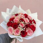 Este espléndido ramo clásico se compone de 12 rosas rojas y 12 rosas rosadas, acentuadas por 2 paniculatas blancas. Es embellecida con un elegante y sofisticado papel coreano blanco, brindándole un toque de indescriptible delicadeza y elegancia. Su belleza atemporal y su diseño clásico hacen de este ramo una opción perfecta para cualquier ocasión.