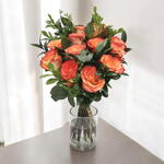 Este vibrante ramo de rosas en tonos naranja es una celebración de calidez y alegría, ideal para iluminar cualquier ocasión especial. Combinadas con follaje fresco y cuidadosamente arregladas, estas rosas emanan energía y vitalidad, convirtiéndolas en el regalo perfecto para cumpleaños, aniversarios o simplemente para alegrar el día de alguien especial. Su color intenso recuerda la pasión de una puesta de sol, mientras que su fragancia sutil llena el ambiente de frescura. Cada flor ha sido seleccionada con esmero para garantizar su frescura y belleza. Un ramo elegante y lleno de vida que es tan cautivador como significativo.