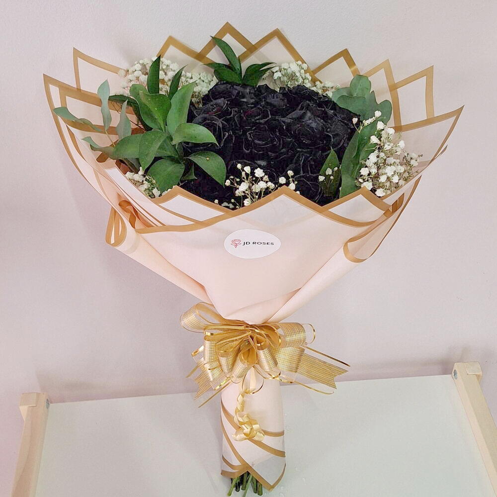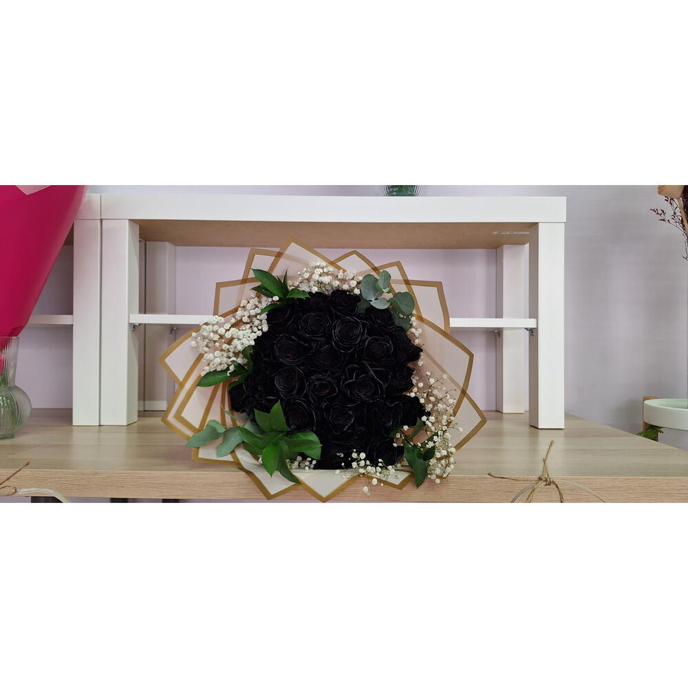 Ruscus - 4 ud. paniculata blanca - 2 ud. lazo de cinta - 1 ud. papel coreano - 4 ud. rosas negras tinturadas - 25 ud.