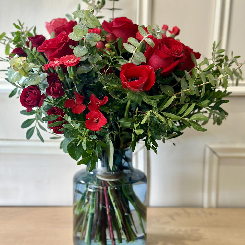 Elegante ramo con nuestras mejores rosas rojas de calidad extra, mezcladas con una selección especial de flores en tonos rojos
