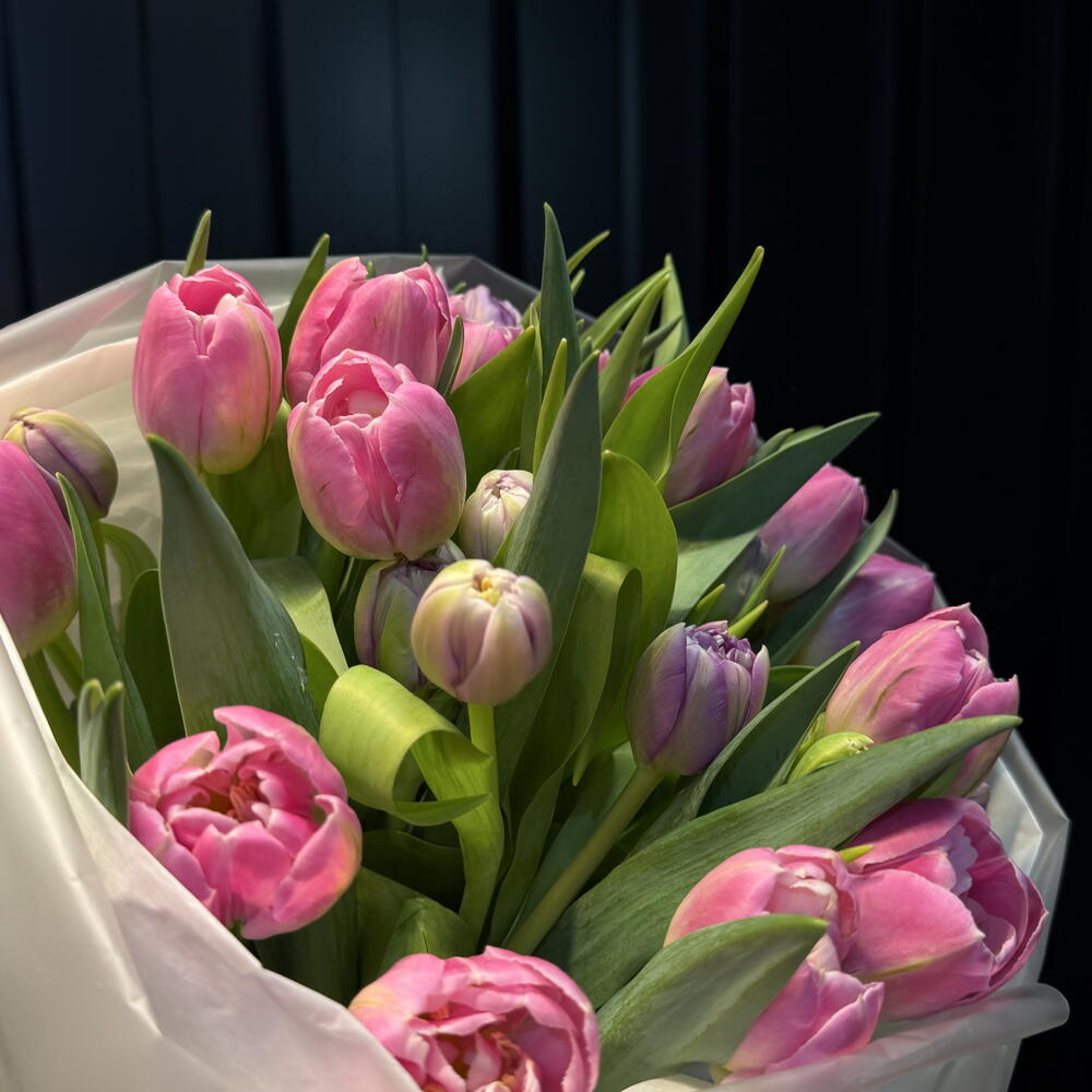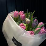 Ramo elegante de tulipanes en tono melocotón suave, cuidadosamente seleccionados en estado semiabierto para garantizar mayor duración y una apertura espectacular en casa. Sus pétalos delicados con matices cálidos contrastan con el verde intenso y fresco de las hojas largas, creando una composición moderna y sofisticada.