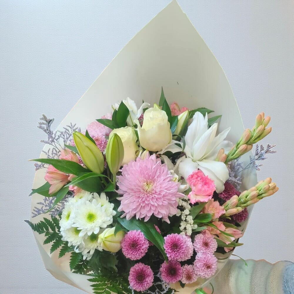 Un ramo delicado y romántico que combina tonos suaves de blanco, rosa y lila, perfecto para transmitir cariño, gratitud o para celebrar momentos especiales. Las rosas blancas y lirios aportan pureza y elegancia, mientras que los crisantemos y claveles rosados llenan el arreglo de frescura y dulzura. Para que el ramo conserve su belleza, coloque las flores en un jarrón con agua limpia, cambie el agua cada dos días y recorte los tallos en diagonal. Manténgalo alejado de la luz solar directa y de corrientes de aire para prolongar su frescura.