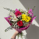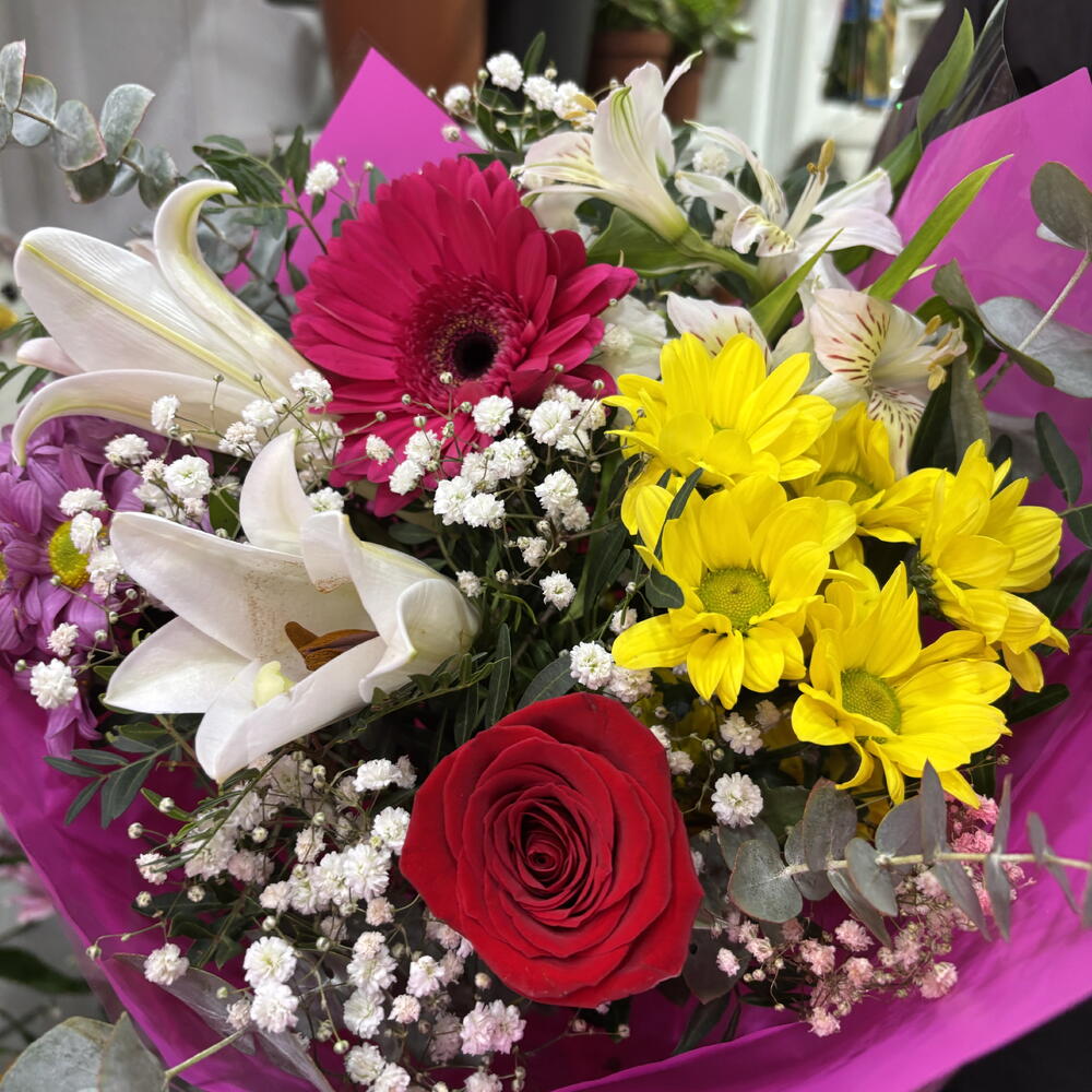rosa roja - 1 ud. verdes variados - 5 ud. Gerbera fucsia - 1 ud. alstroemeria blanca - 4 ud. lirio blanco - 2 ud. crisantemos amarillos - 6 ud. gypsophila blanca - 3 ud.