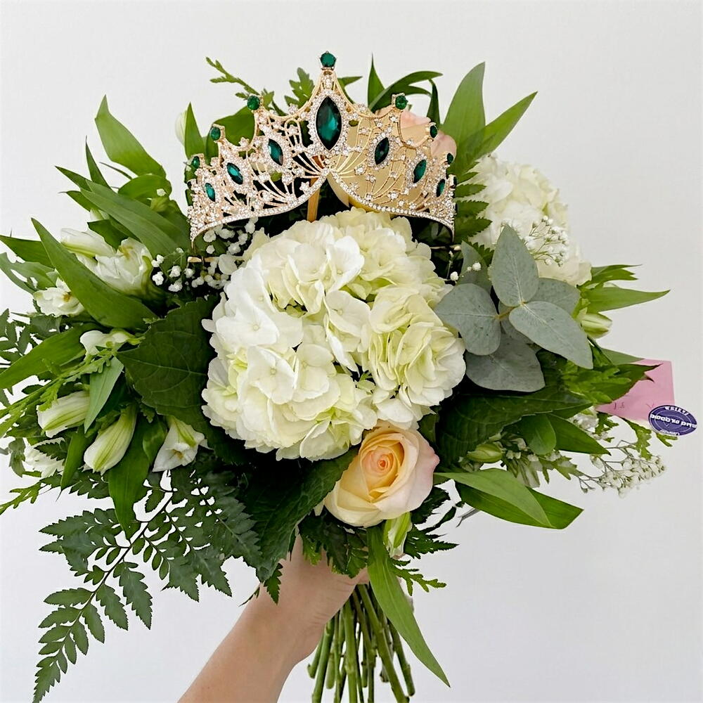 Solidago - 3 ud. eucalipto - 3 ud. rosas blancas - 5 ud. astromelia - 8 ud. helecho - 2 ud. corona - 1 ud. hortensia blanca: - 2 ud.